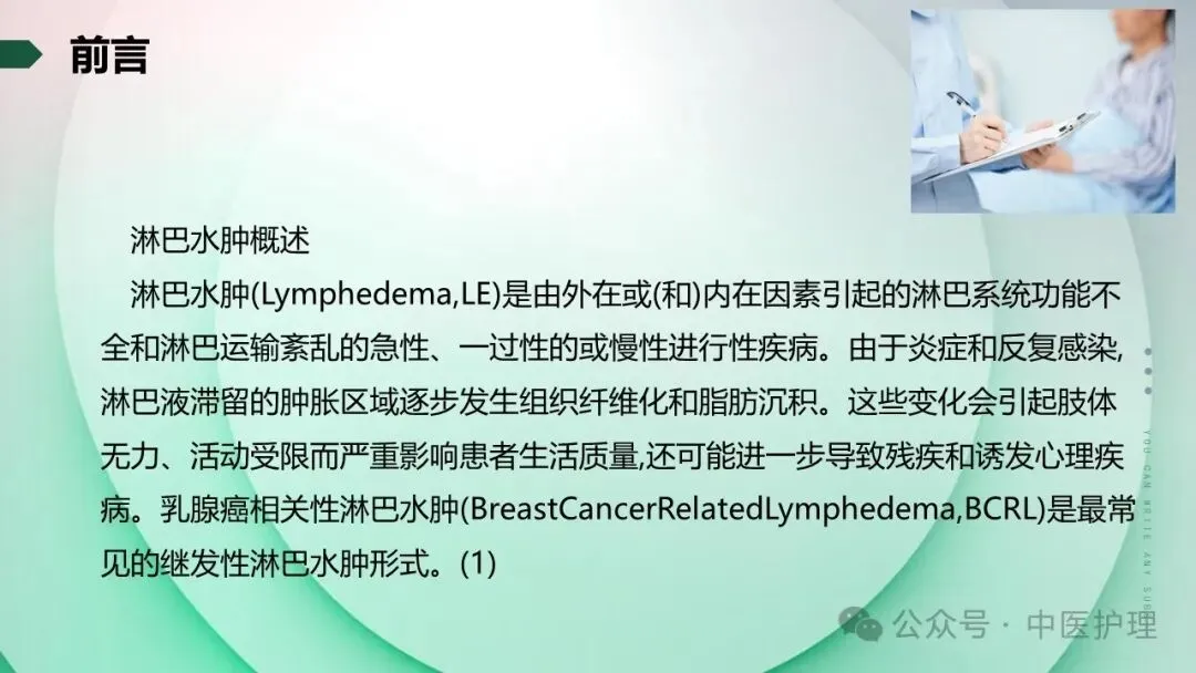 淋巴水肿(Lymphedema,LE)是由外在或(和)内在因素引起的淋巴系统功能不全和淋巴运输紊乱的急性、一过性的或慢性进行性疾病。由于炎症和反复感染,淋巴液滞留的肿胀区域逐步发生组织纤维化和脂肪沉积。这些变化会引起肢体无力、活动受限而严重影响患者生活质量,还可能进一步导致残疾和诱发心理疾病。乳腺癌相关性淋巴水肿(BreastCancerRelatedLymphedema,BCRL)是最常见的继发性淋巴水肿形式。