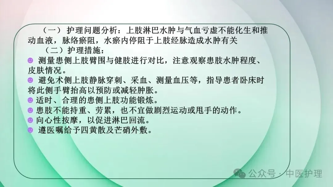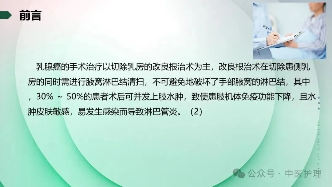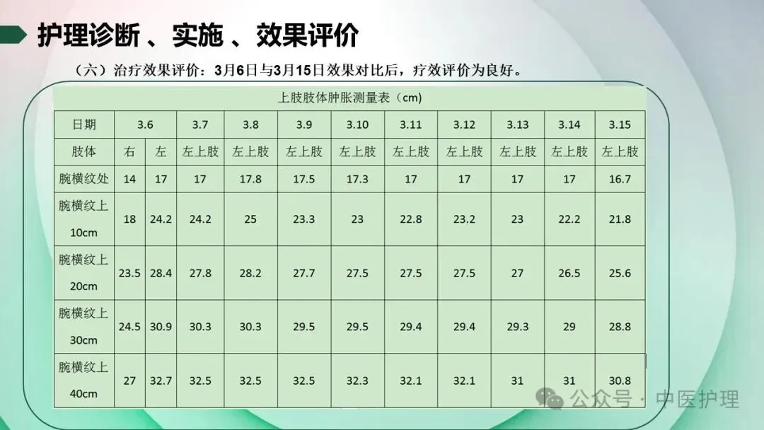 该文章,通过对我院科室一例乳腺癌术后上肢淋巴水肿患者的个案护理,分享验证中医在淋巴水肿治疗方面的特殊疗效。