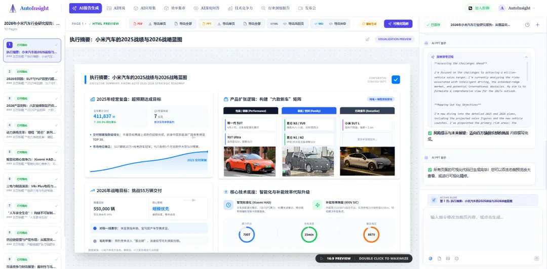 真正的 .pptx 格式,每一处文字、图表皆可修改。Google NotebookLM 只能看不能改?AutoInsight Canvas*说:那是对生产力的侮辱。- 原生 PPT 格式导出:这是对职场人最后的温柔。一键导出 .pptx 原件,在你的 PowerPoint 软件里流畅修改,保持你 100% 的个人风格。