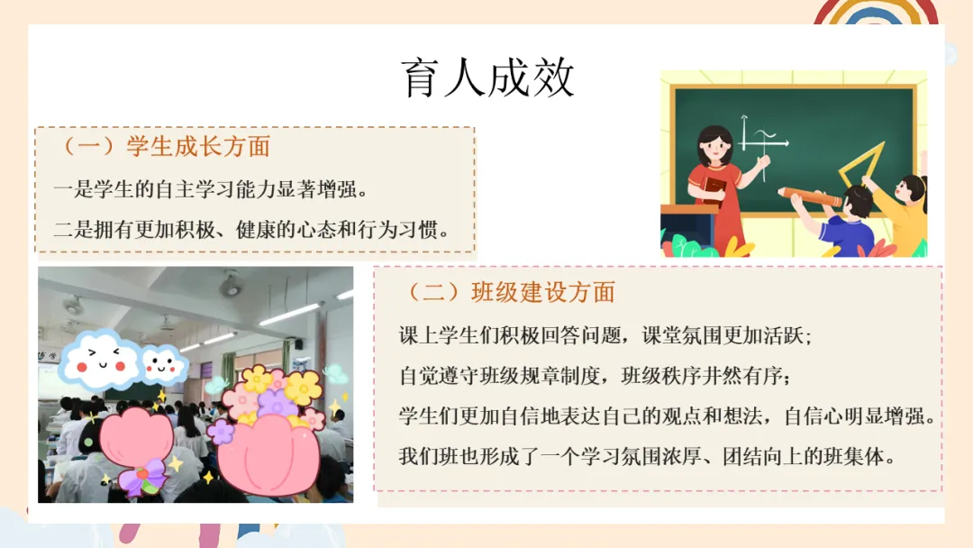 这一切的努力,最终也结出了丰硕的果实。学生们的自主学习能力明显增强,心态更加积极健康;课堂上,他们敢于表达、乐于参与;班级秩序井然,团结互助成为常态。更重要的是,他们眼中有了光,心中有了梦。