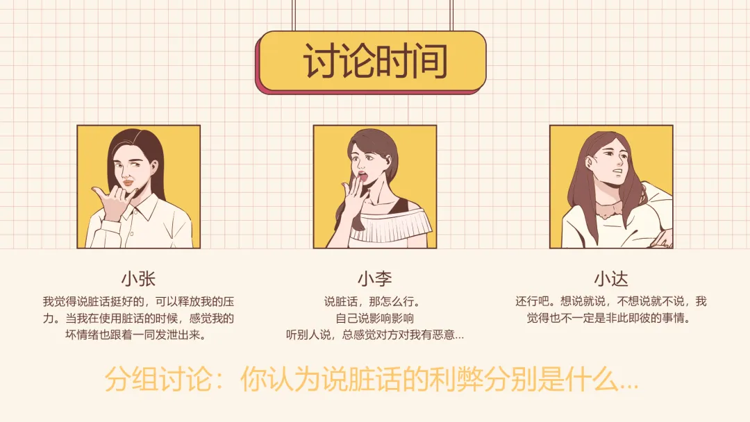 我们班上的小张觉得,说脏话可以释放压力;小李觉得,听到别人说脏话会让自己不舒服;小达觉得,这没什么大不了的。