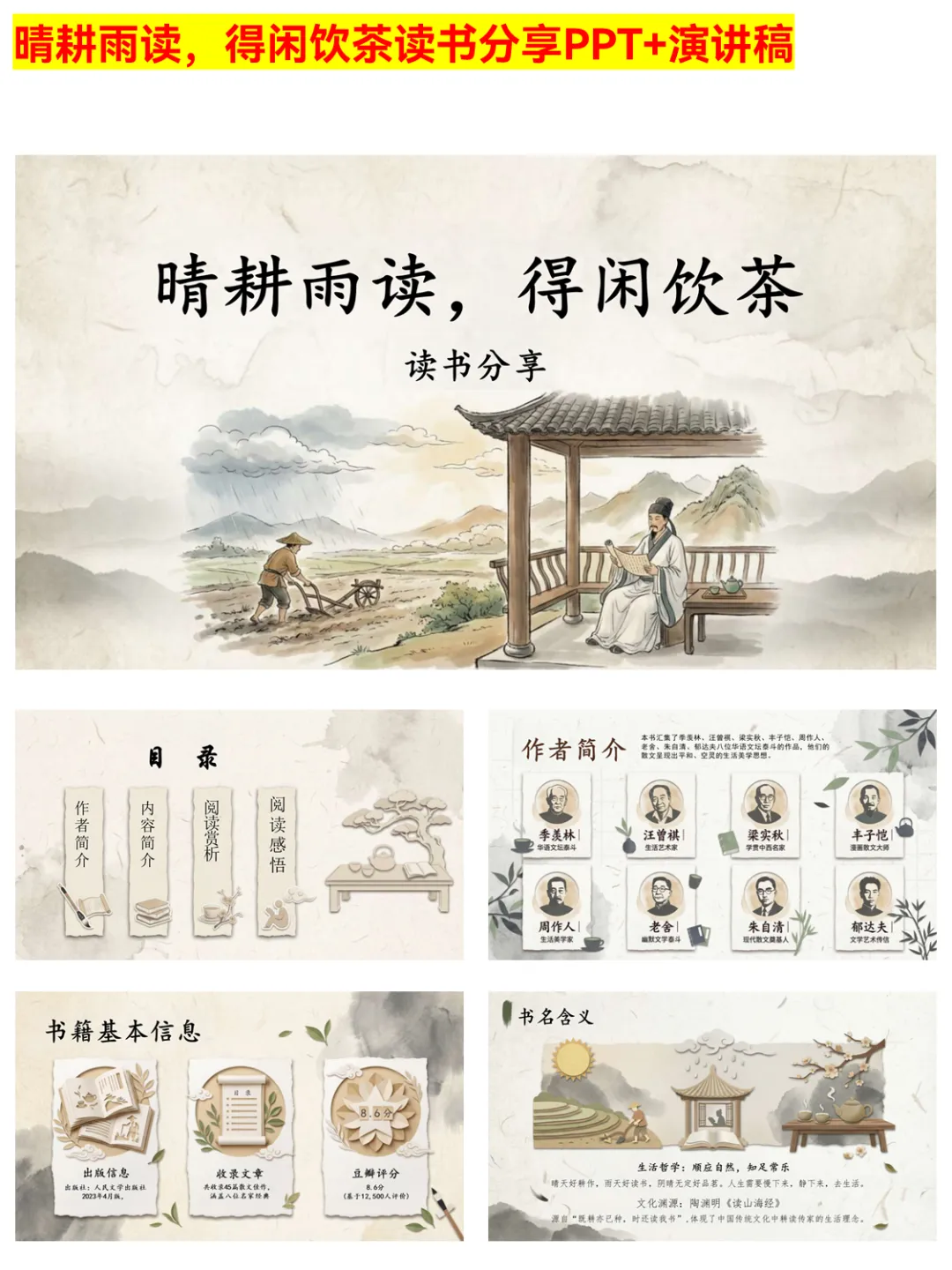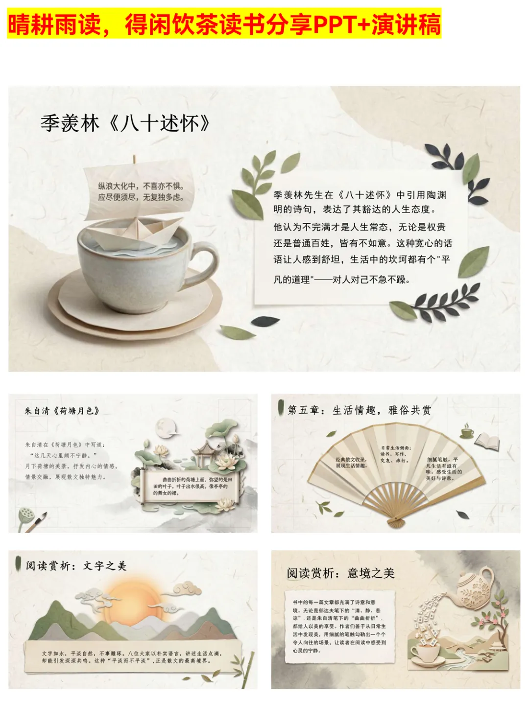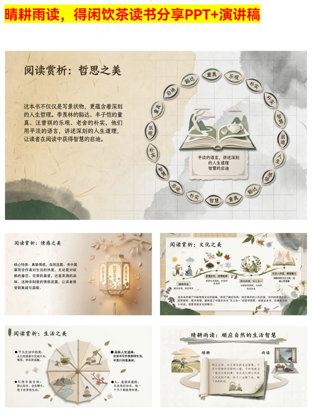 被《晴耕雨读,得闲饮茶》的读书分享PPT治愈到了!PPT围绕“顺应自然,知足常乐”的生活哲学,通过八位大家的作品,展现茶酒中的人生智慧、草木里的生命哲思。文字朴实无华却直击人心,还拆解了书中的情感美、文化美,适合想在快节奏生活中慢下来的你,用来做读书分享或自我品读都超合适。 #晴耕雨读得闲饮茶 #读书分享PPT #慢生活美学 #散文读书分享 #生活智慧 #阅读感悟 #文学PPT #读书推荐 #内心安宁 #传统文化美学