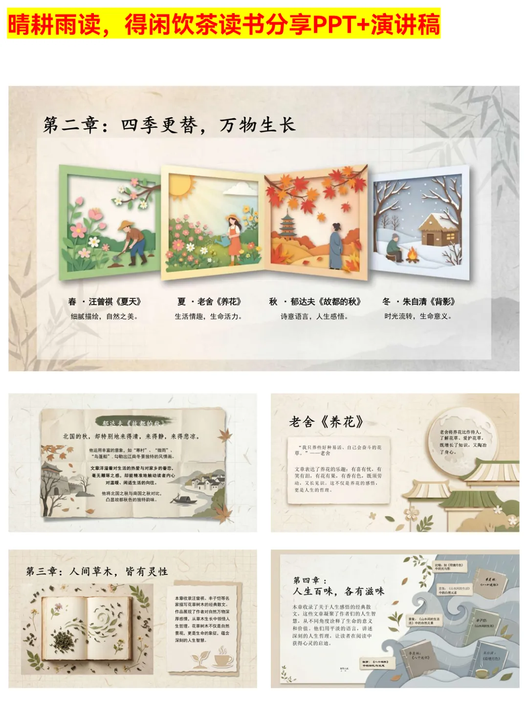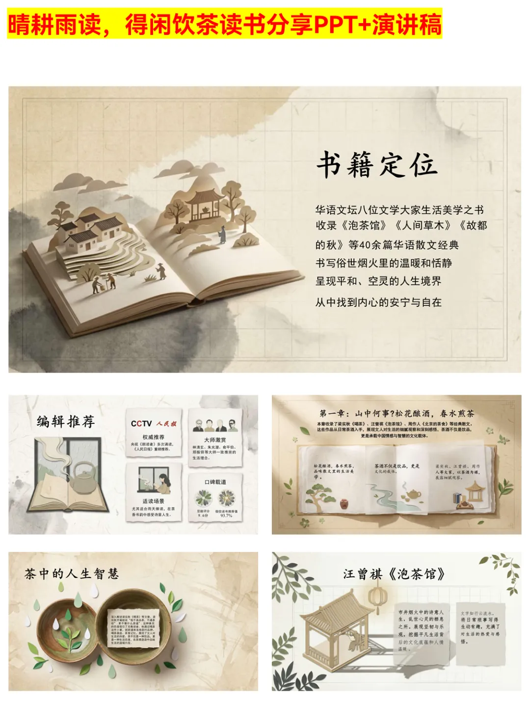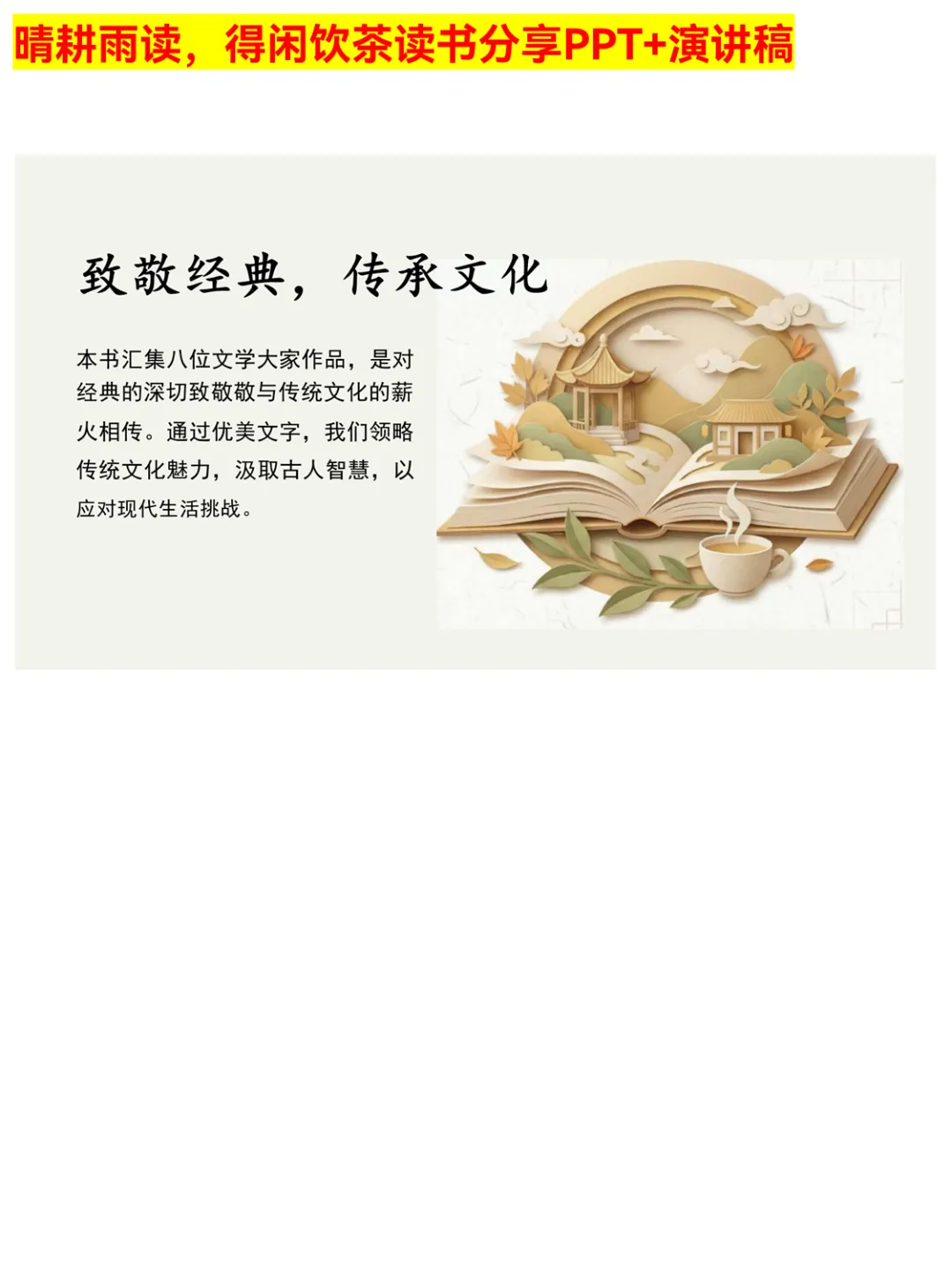 被《晴耕雨读,得闲饮茶》的读书分享PPT治愈到了!PPT围绕“顺应自然,知足常乐”的生活哲学,通过八位大家的作品,展现茶酒中的人生智慧、草木里的生命哲思。文字朴实无华却直击人心,还拆解了书中的情感美、文化美,适合想在快节奏生活中慢下来的你,用来做读书分享或自我品读都超合适。 #晴耕雨读得闲饮茶 #读书分享PPT #慢生活美学 #散文读书分享 #生活智慧 #阅读感悟 #文学PPT #读书推荐 #内心安宁 #传统文化美学