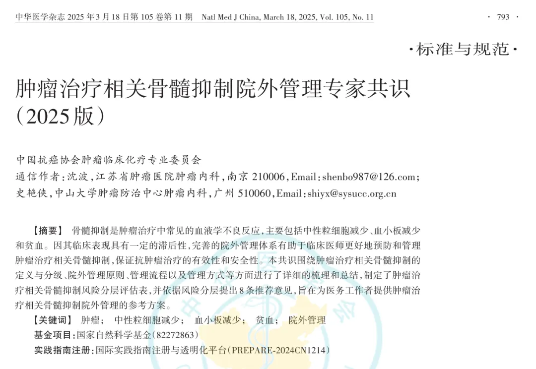 在具体管理措施上,共识针对三类骨髓抑制分别给出预防与治疗方案:高危人群预防性使用 G-CSF,中性粒细胞减少以 rhG-CSF 为主要治疗药物;血小板减少高危者可预防性使用促血小板生成药物,治疗结合血小板输注与相关药物;不建议预防性使用 EPO,贫血治疗以输注红细胞、EPO 为主,辅以营养干预。同时,中医中药可作为辅助治疗手段。
