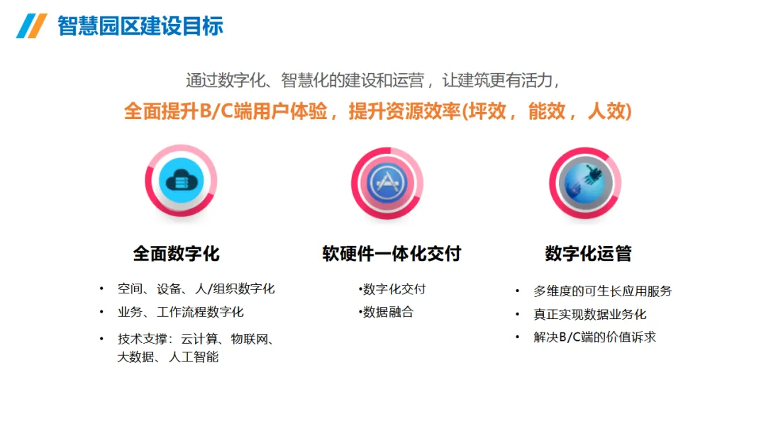 本方案旨在打造未来科技城区域内首屈一指的超5A标准办公产业园区,以“云、管、边、连、端”一体化智慧建筑架构为核心,实现生态办公与产业创新的有机融合,为园区管理者、入驻企业、员工等内外部客户提供全方位智慧化服务。方案核心目标是通过数字化、智慧化建设与运营,提升B/C端用户体验及坪效、能效、人效等资源效率,打造区域示范标杆。