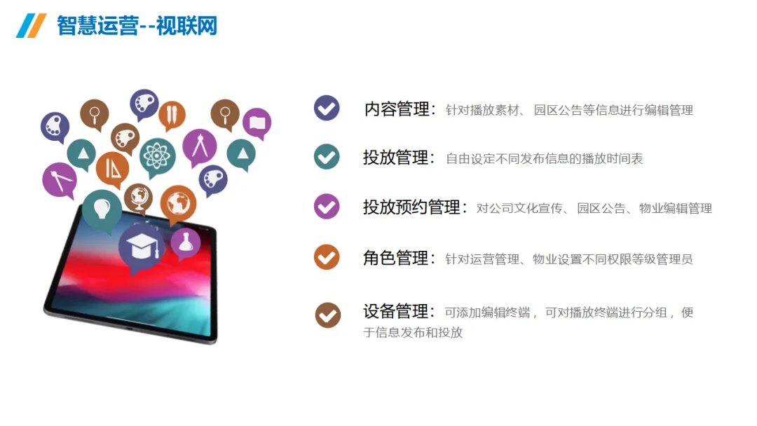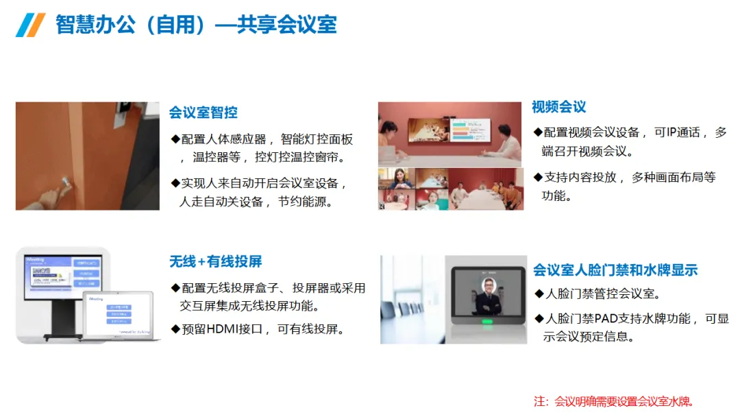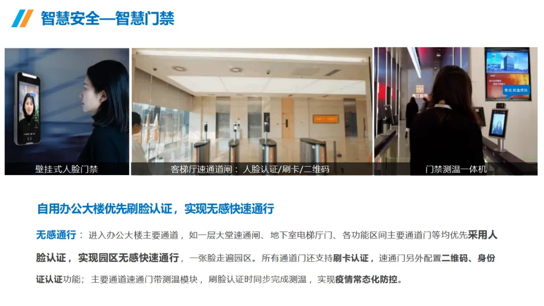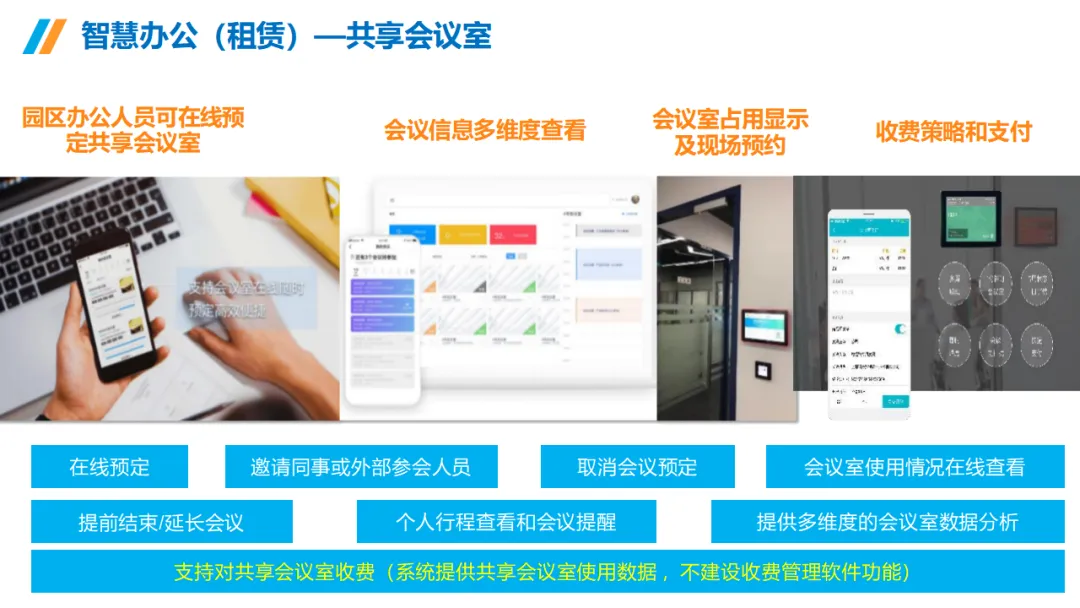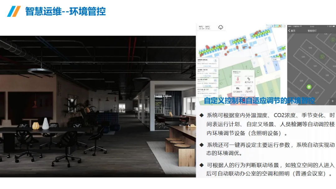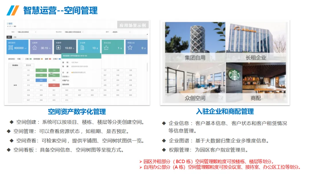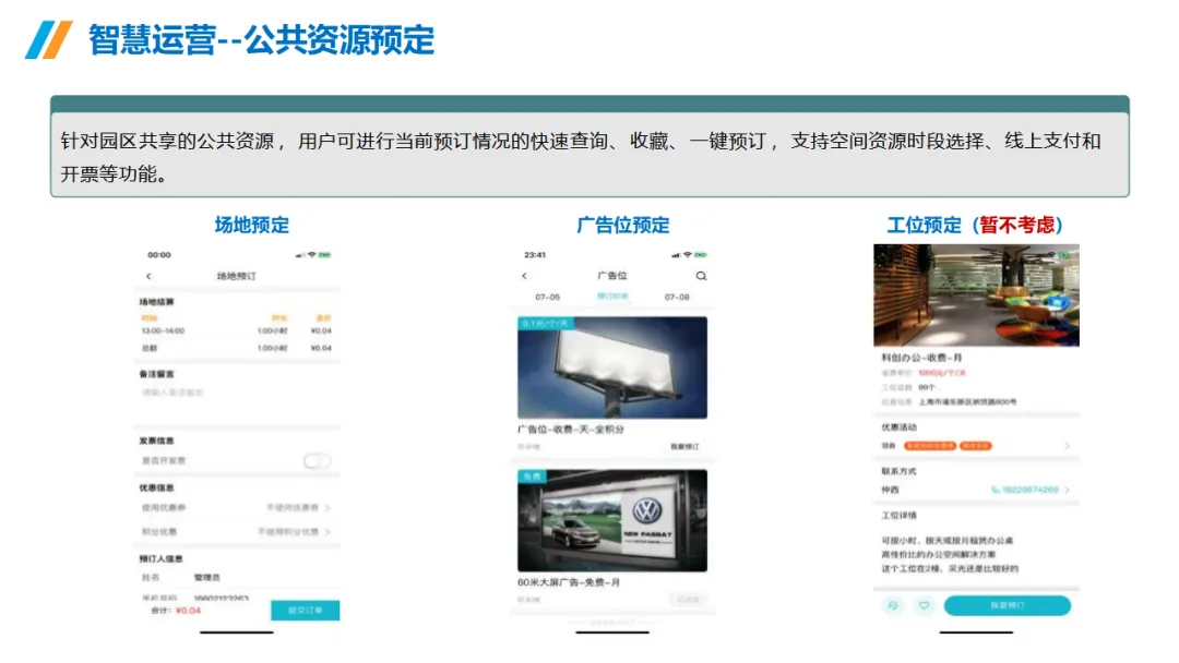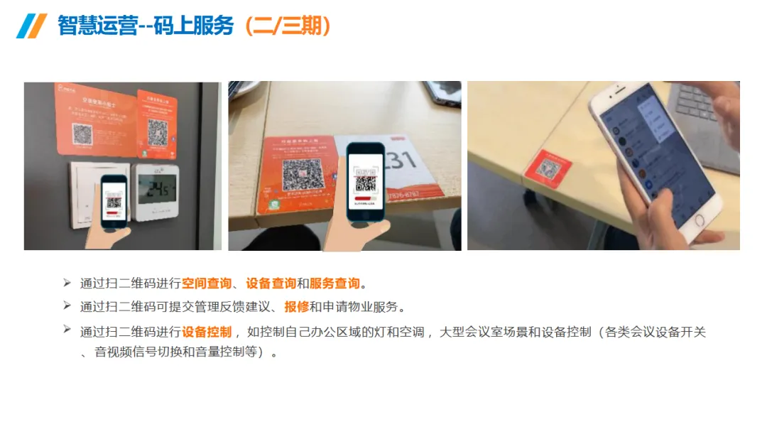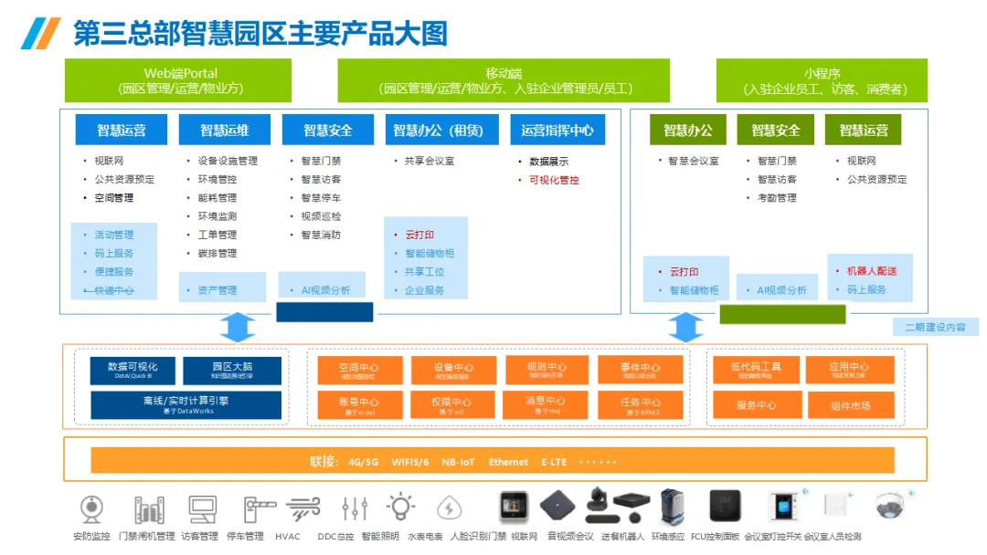 方案构建了涵盖智慧运营、智慧运维、智慧安全、智慧办公四大核心场景的应用体系,包括视联网、公共资源预定、设备设施管理、智慧门禁、共享会议室等多元功能,分阶段推进建设。平台架构采用云底座支撑,搭配园区大脑、离线/实时计算引擎等智能能力,通过低代码工具赋能应用开发,实现空间、设备、人员的全面数字化。