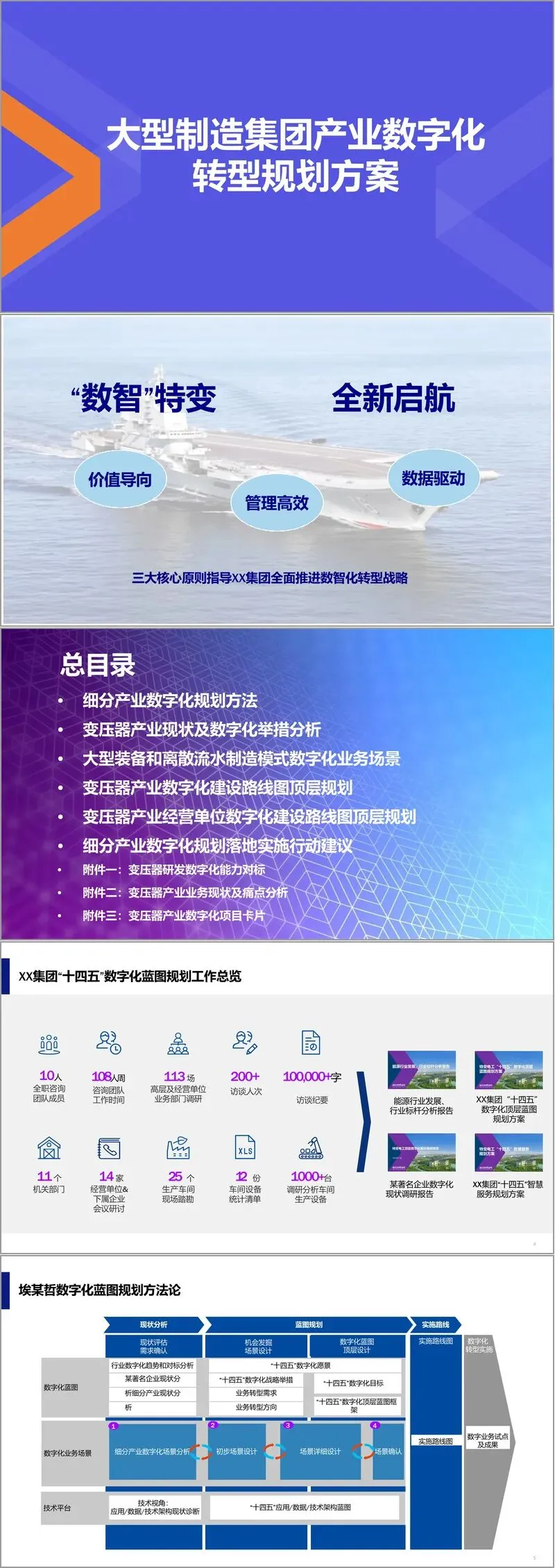 本文件系统阐述了一家大型制造集团产业数字化转型的全面规划方案,围绕“数智特变,全新启航”的愿景,提出了数据驱动、价值导向、管理高效三大核心原则。该方案基于对变压器产业的深入分析,构建了完整的数字化转型框架和实施路径。