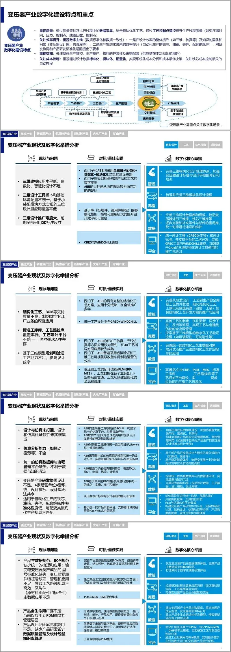 在研发数字化方面,方案强调要实现从传统设计向基于三维模型的设计转型。通过建立完善的三维模块化设计体系,统一设计工具和标准,实现设计与仿真的深度融合。特别是在变压器研发领域,提出了参数化设计、模块化重用、仿真验证等具体措施,以提升研发效率和质量。