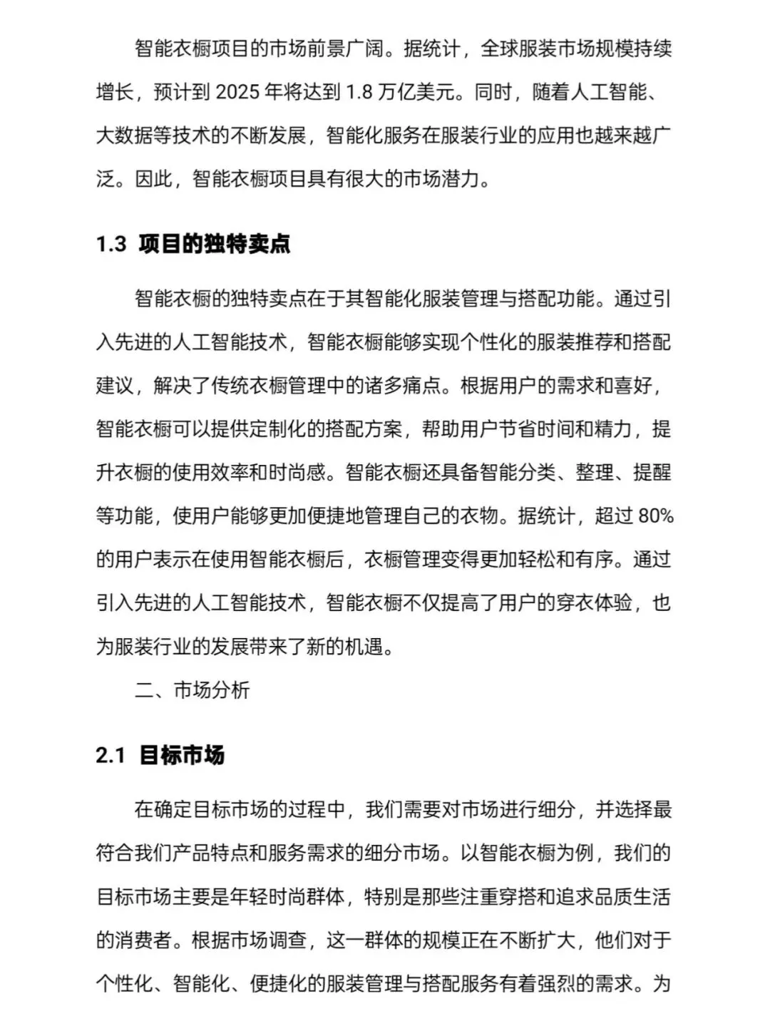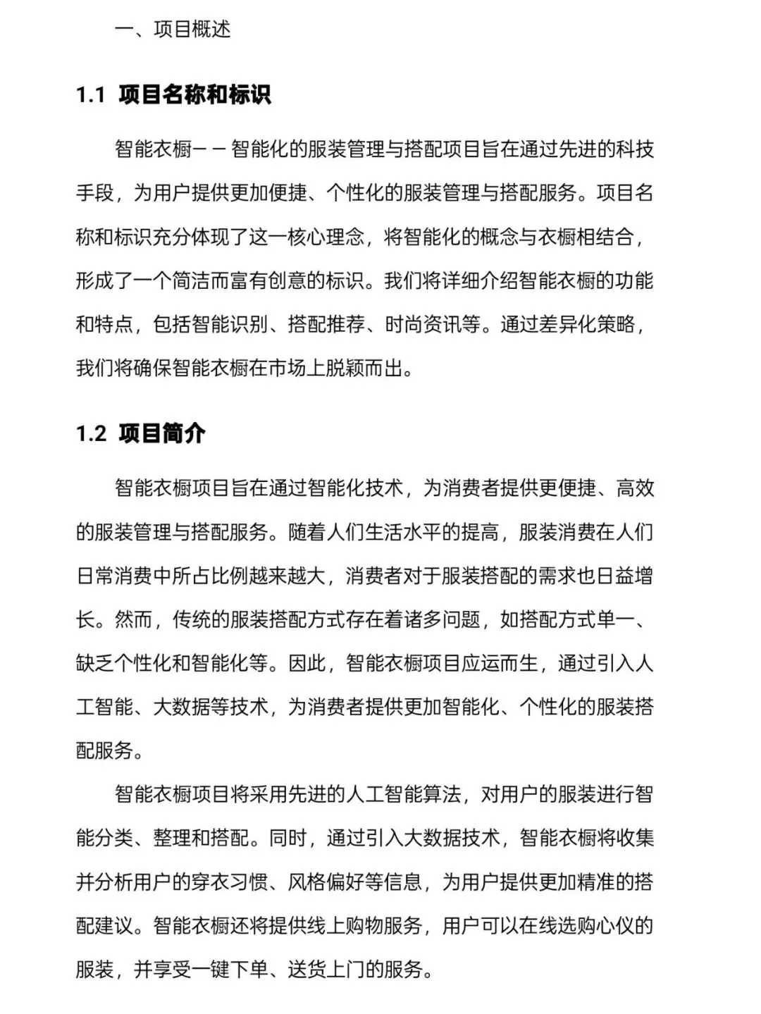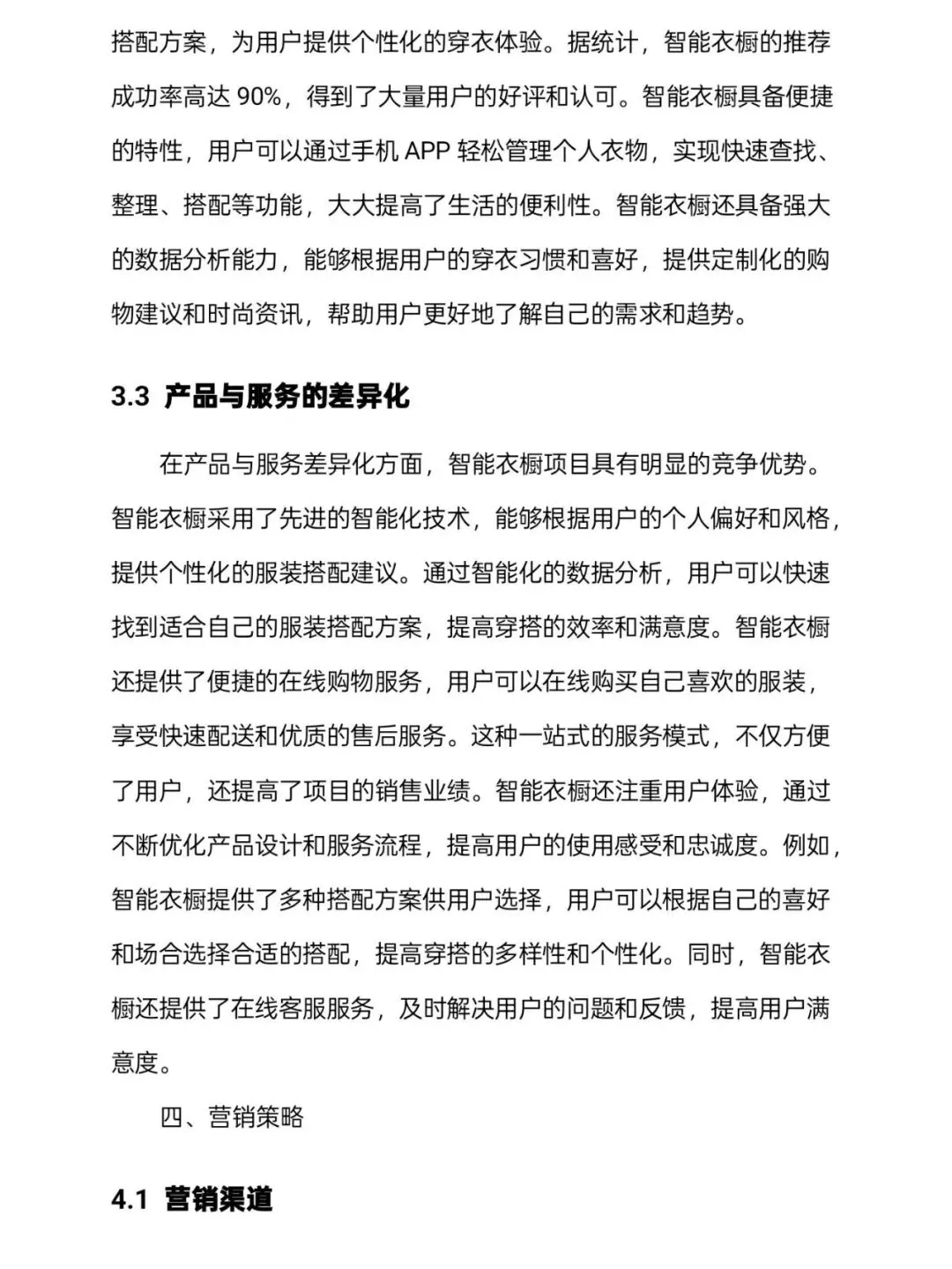 👔智能衣橱——智能化的服装管理与搭配项目旨在通过先进的科技手段,为用户提供更加便捷、个性化的服装管理与搭配服务。项目名称和标识充分体现了这一核心理念,将智能化的概念与衣橱相结合,形成了一个简洁而富有创意的标识。我们将详细介绍智能衣橱的功能和特点,包括智能识别、搭配推荐、时尚资讯等。通过差异化策略,我们将确保智能衣橱在市场上脱颖而出。#大学生创新创业计划书ppt[话题]# #大学生创新创业计划书[话题]# #商业计划书PPT[话题]# #智能衣橱[话题]# #创业计划书大学生版[话题]# #大学生创业计划书模板[话题]# #创业计划书怎么写[话题]# #创业计划书完整版[话题]# #互联网加[话题]# #创业大赛[话题]#