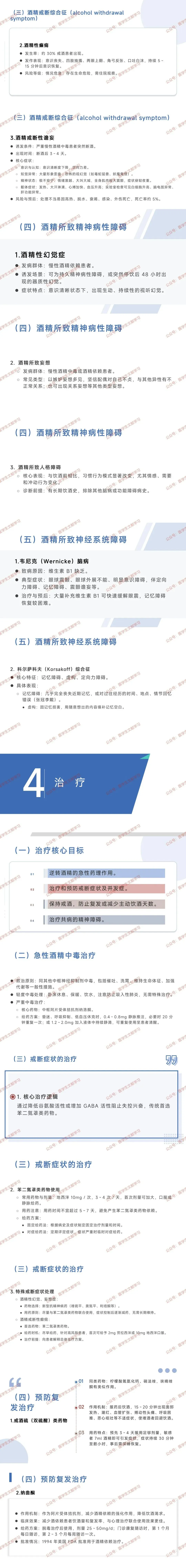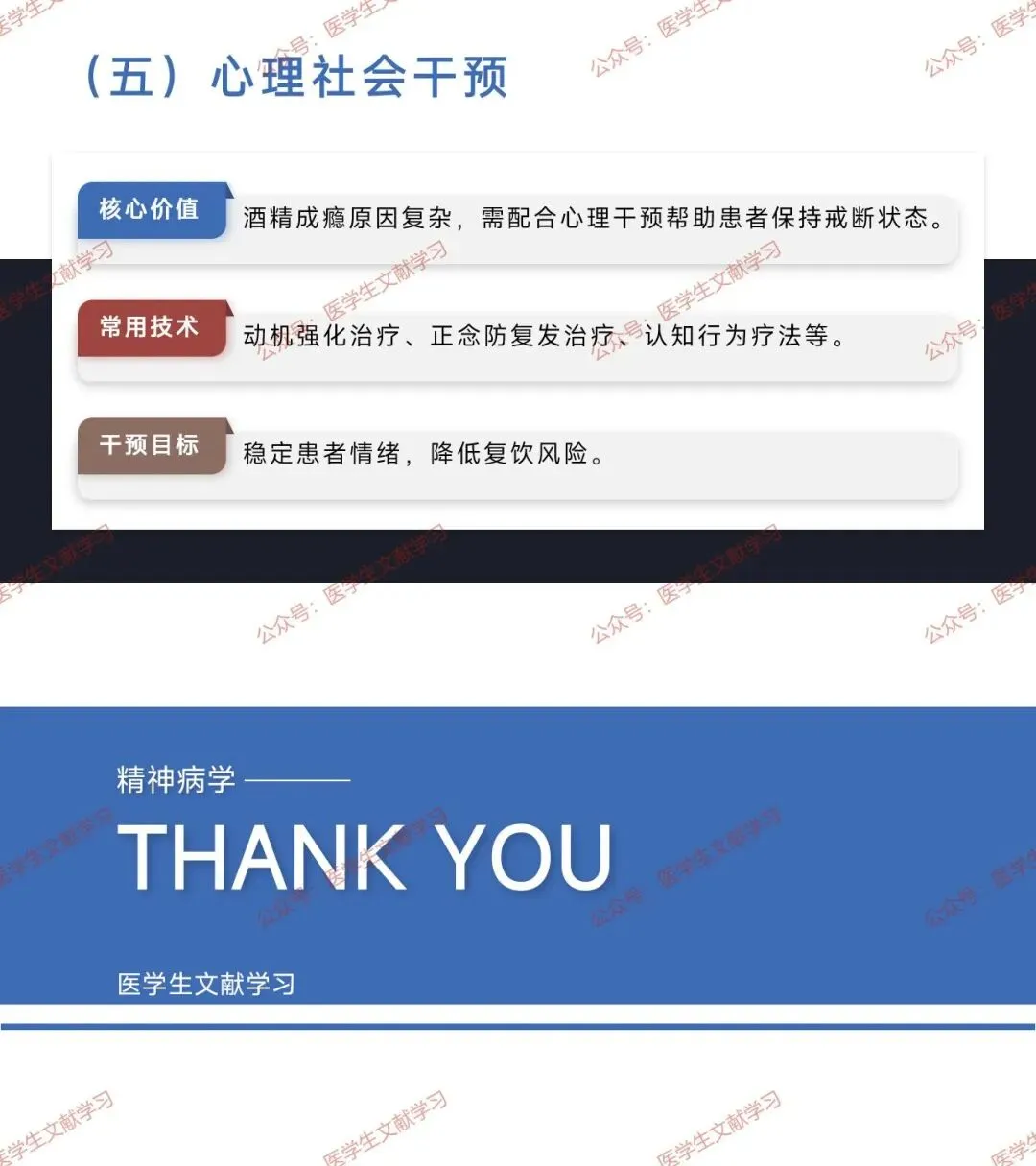 - 逆转急性药理作用,治疗与预防戒断症状及并发症,保持戒酒、减少复发,治疗共病精神障碍。