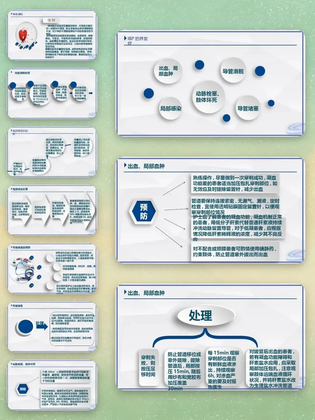 高频操作与护理考点包括:动脉波形异常的排查处理,导管堵塞的规范处理原则(严禁强行冲管),各类并发症的预防措施,拔管后的按压时长与护理要点,管路护理的无菌操作规范,这些也是临床实操考核的核心评分点。