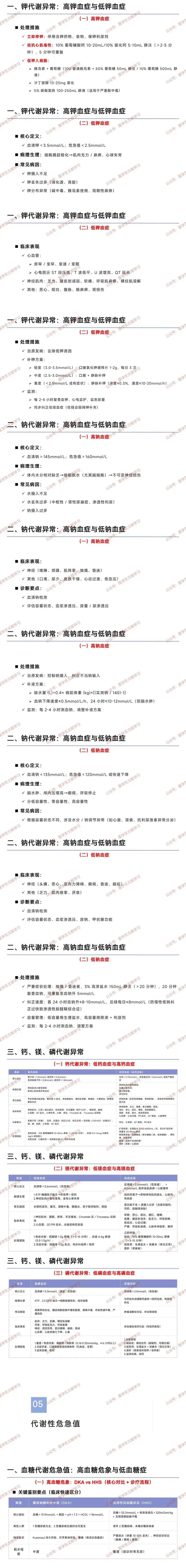 - 低镁血症:血清镁<0.6mmol/L(危急值)。病理生理为 ATP 酶辅因子缺乏,伴低钾低钙,神经肌肉兴奋性增高等。病因有长期利尿等。临床表现有神经肌肉、心血管症状。处理上有症状者用硫酸镁静推或静滴,无症状者肌注,同步纠低钾低钙。