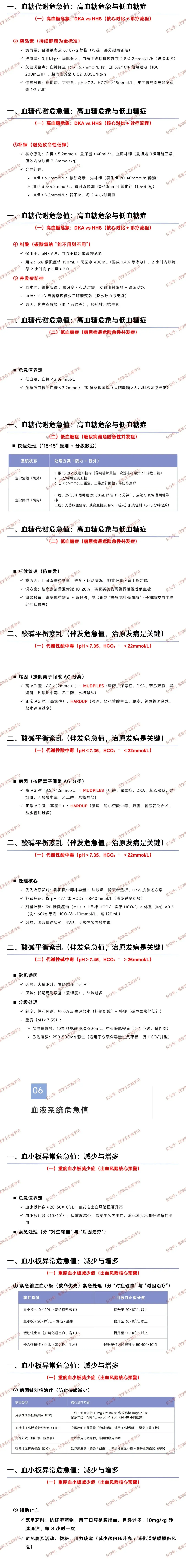 - 低磷血症:血清磷<0.3mmol/L(重度,危急值)。病理生理为 ATP 等缺乏,致细胞能量危机等。病因有再喂养综合征等。临床表现有肌肉、呼吸、神经、心血管症状。处理上重度或有症状者静滴磷酸盐,无症状者口服或食补,监测血磷血钙。