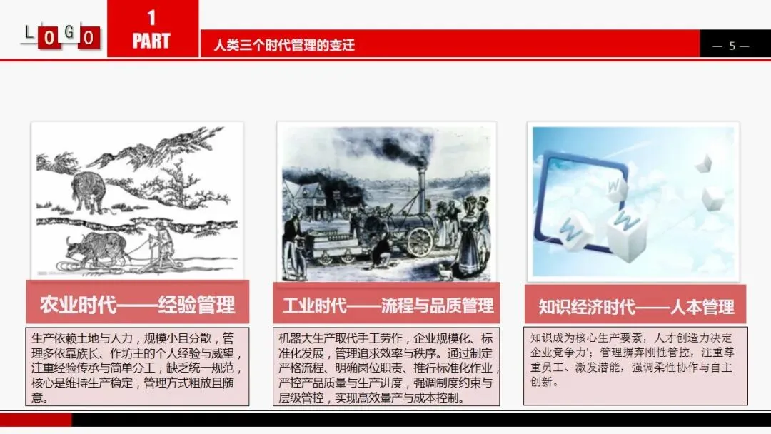 机器大生产取代手工劳作,企业规模化、标准化发展,管理追求效率与秩序。通过制定严格流程、明确岗位职责、推行标准化作业,严控产品质量与生产进度,强调制度约束与层级管控,实现高效量产与成本控制。