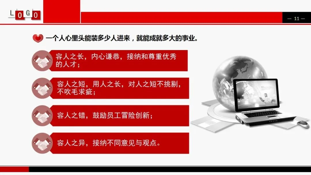 容人之长,内心谦恭,接纳和尊重优秀的人才;