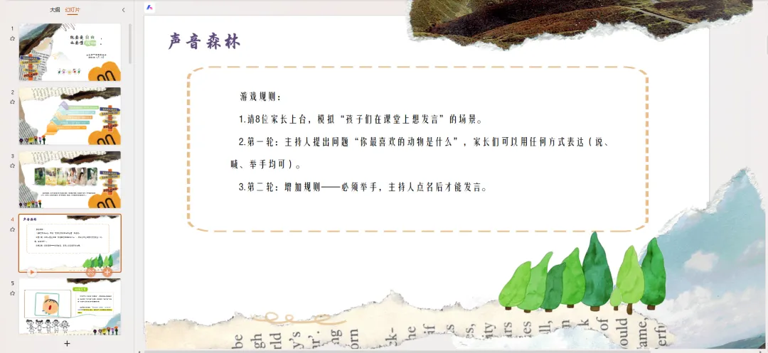 在今天的家长会正式开始之前,我想先请大家玩一个游戏,这个游戏的名字叫:声音森林