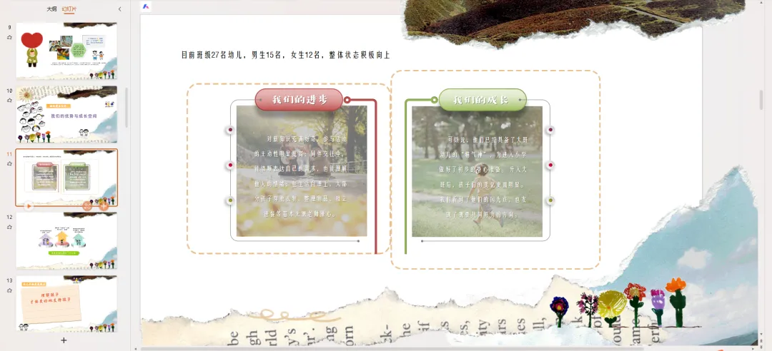 目前班级27名幼儿,男生15名,女生12名,整体状态积极向上:对新知识充满好奇,参与活动的主动性明显提高;同伴交往中,能清晰表达自己的需求,也能理解他人的情绪;在生活自理上,大部分孩子穿脱衣物、整理物品、独立进餐等基本无需老师操心。可以说,他们已经具备了大班幼儿的“精气神”,为进入小学做好了初步的身心准备。 升入大班后,孩子们的变化更加明显。我们看到了他们的闪光点,也发现了需要共同努力的方向。