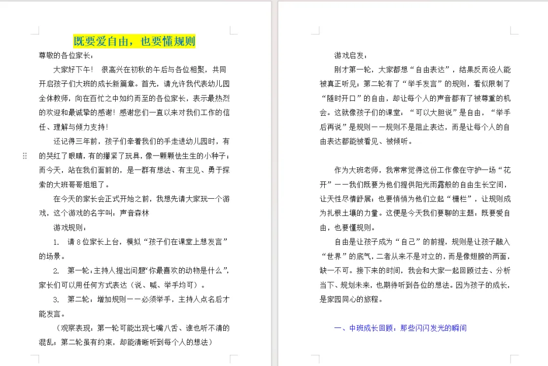 自由是让孩子成为“自己”的前提,规则是让孩子融入“世界”的底气,二者从来不是对立的,而是像翅膀的两面,缺一不可。接下来的时间,我会和大家一起回顾过去、分析当下、规划未来,也期待听到各位的想法。因为孩子的成长,是家园同心的旅程。