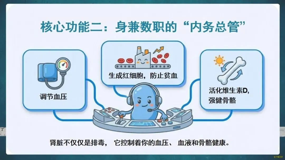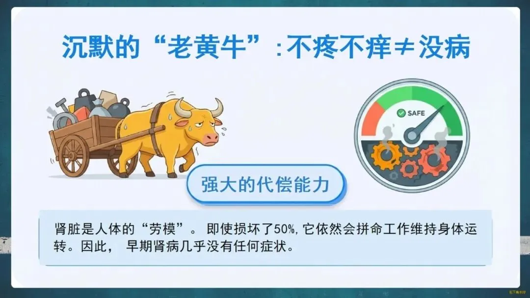 肾脏被誉为身体的“超级净水器”和“内务总管”,每天过滤约200升血液,不仅排出毒素,还调节血压、生成红细胞、强健骨骼。然而,它也是一位“沉默的老黄牛”,即使受损50%仍默默工作,导致早期肾病几乎无症状。数据显示,我国每10人中就有1人患有慢性肾病,但知晓率极低,许多人发现时已至晚期。