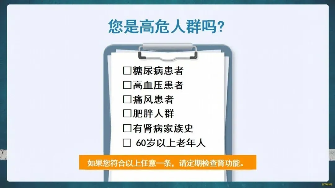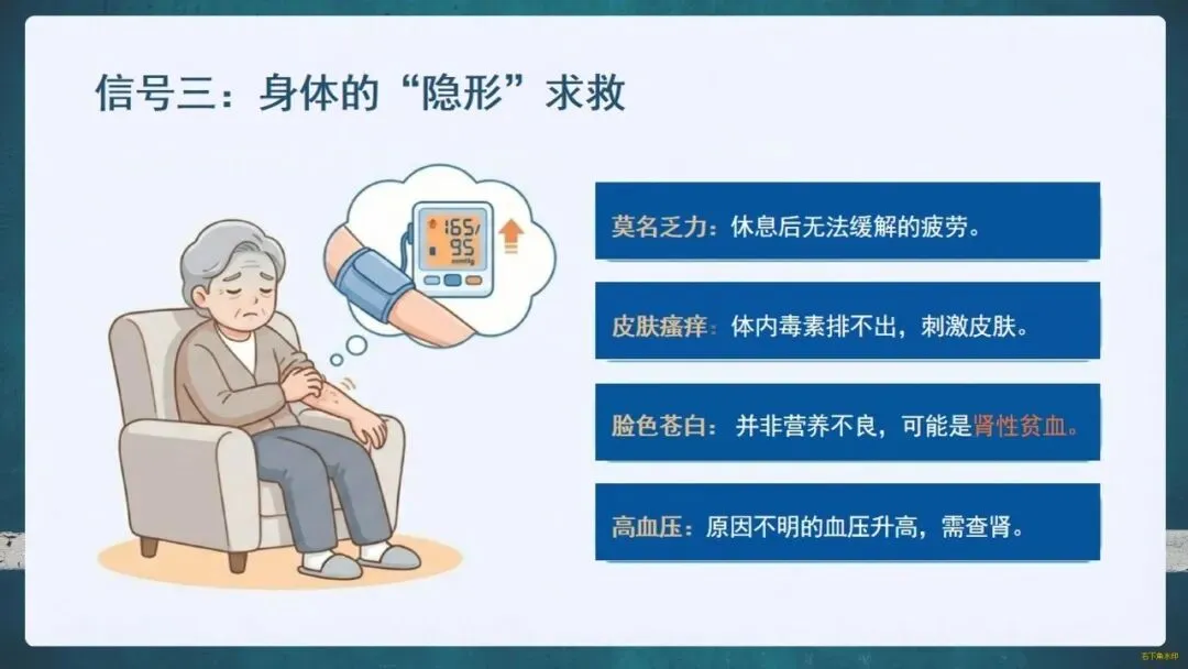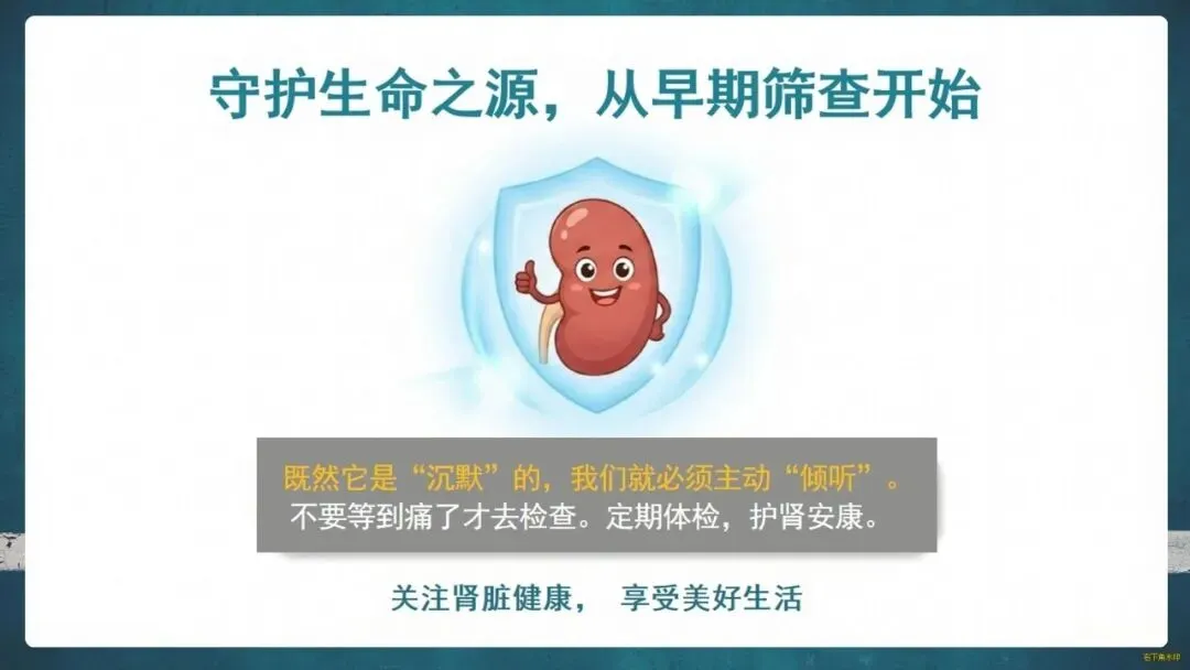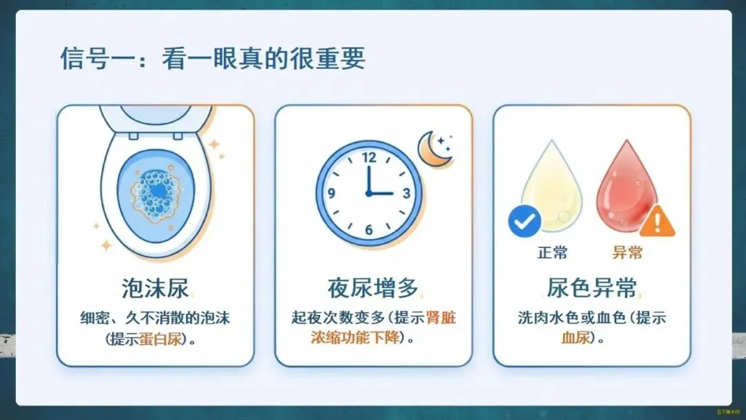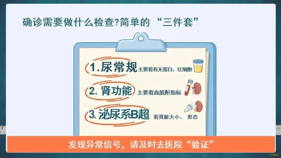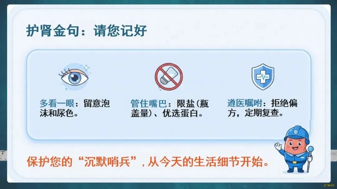 那么,如何守护这位“沉默哨兵”?关键在于“早筛查、早预防”。请留意身体的求救信号:泡沫尿、夜尿增多、眼睑或下肢水肿、莫名乏力等。定期做尿常规、肾功能和泌尿系B超这“三件套”检查至关重要。