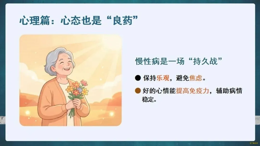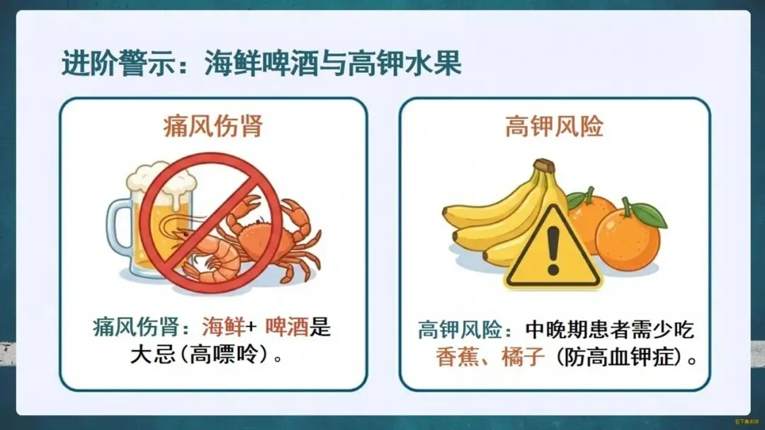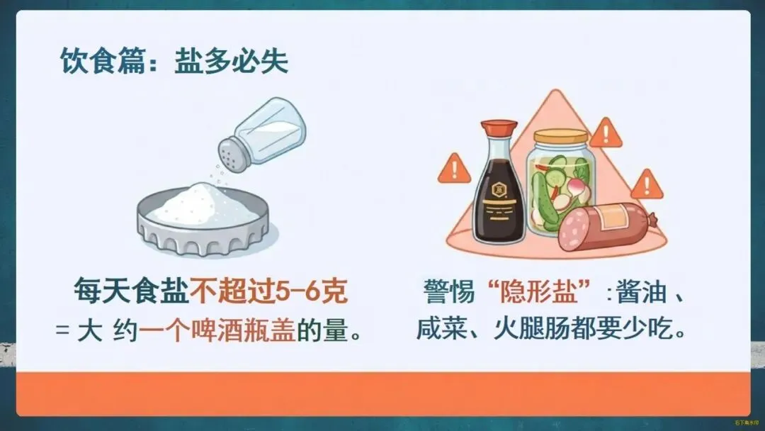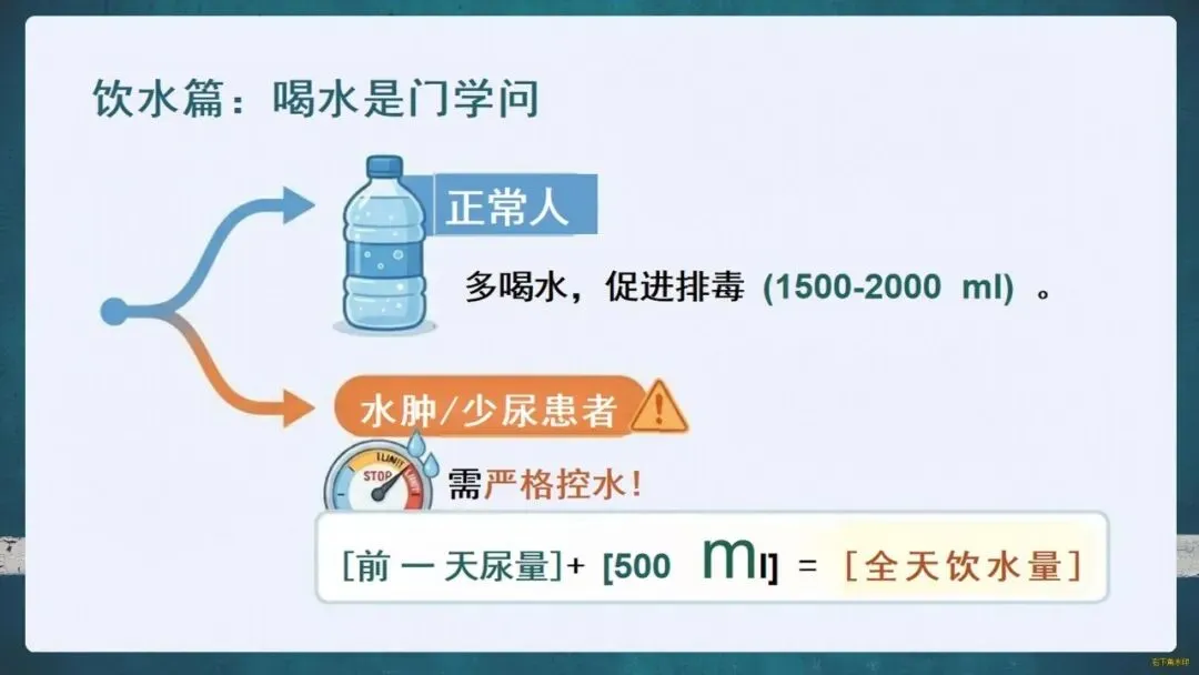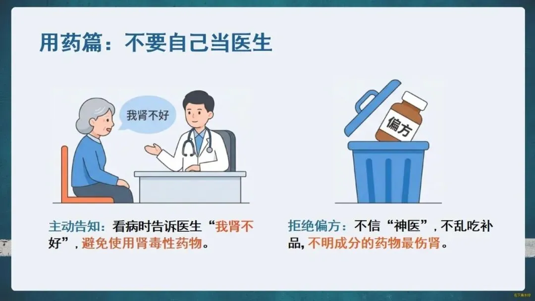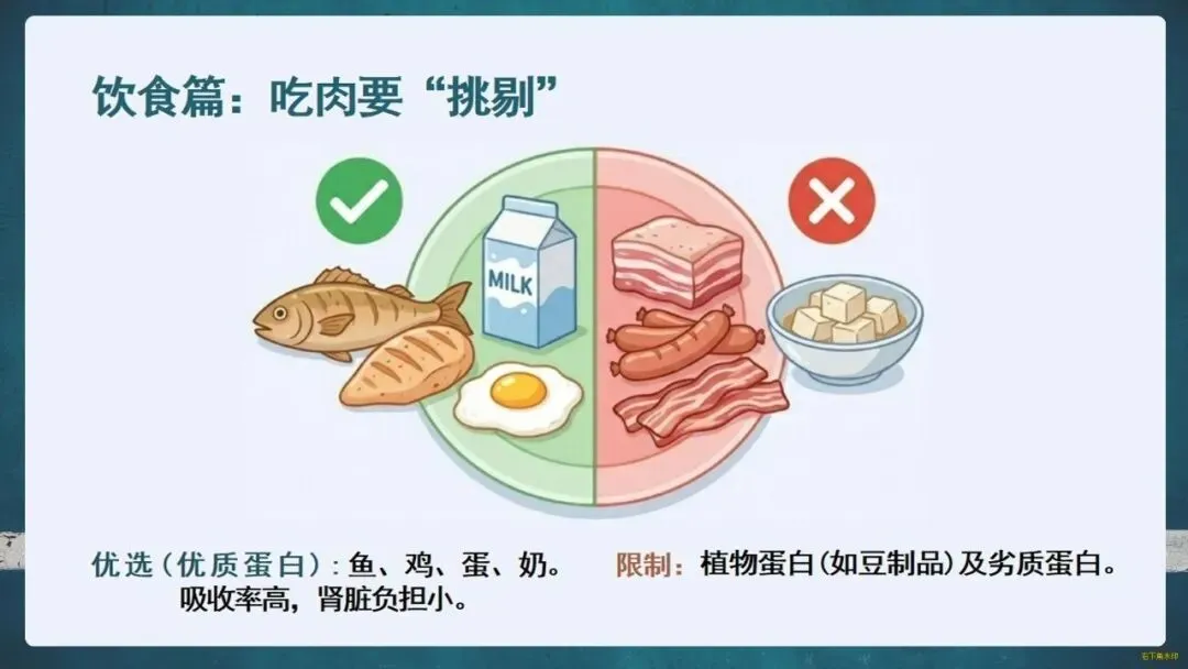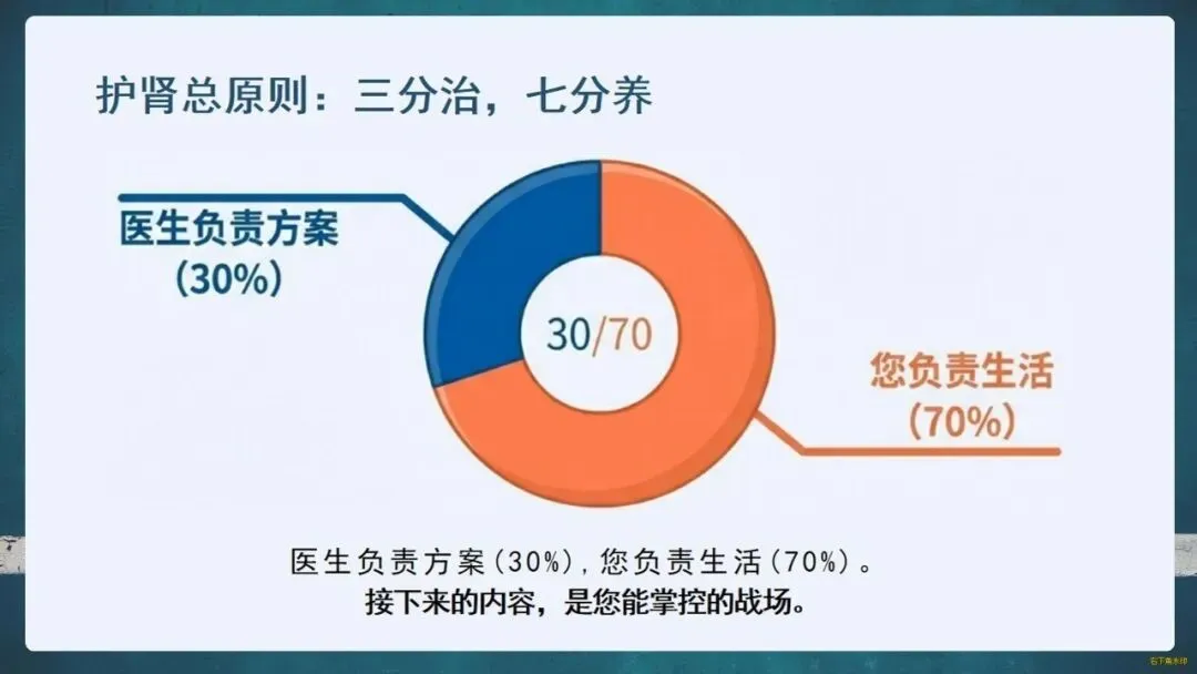 护肾原则是“三分治,七分养”。生活中要管住嘴:每日食盐不超过一啤酒瓶盖,优选鱼、蛋、奶等优质蛋白;科学饮水,适度运动;更要遵医嘱,拒绝偏方和滥用药物。