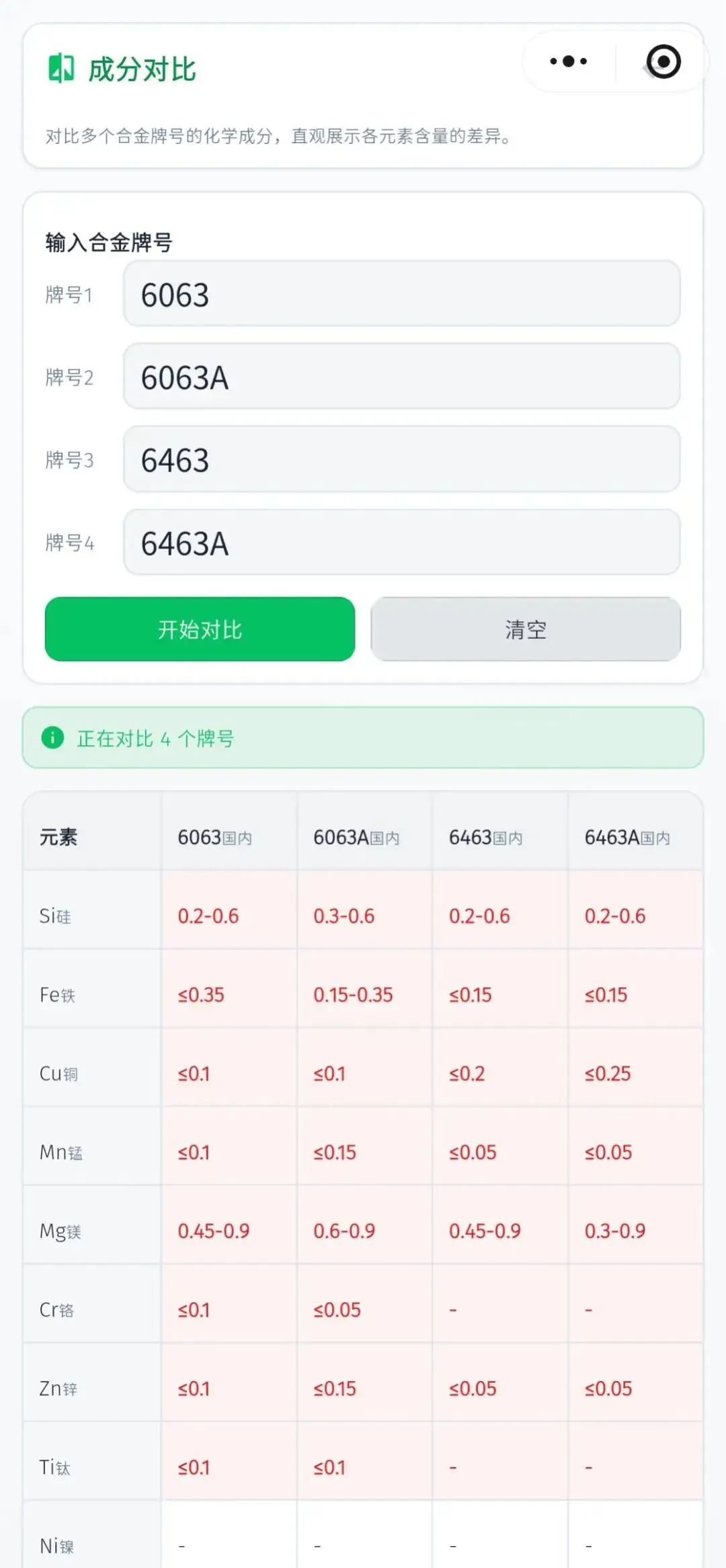 3. 输入你想对比的牌号(比如6063、6063A、6463……),点击 「开始对比」
