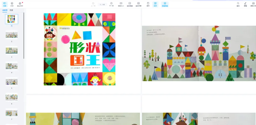 绘本阅读是幼儿教育的重要方式,但许多家长因孩子不识字或价格高而忽视其价值。实际上,绘本通过图文结合能同时刺激儿童的视觉和语言发展。优质绘本能提升儿童的认知、语言和社交能力。长期阅读对学业发展和亲子关系都有积极影响。绘本既是学习工具,也是亲子互动的桥梁。绘本PPT通过丰富多彩的故事和生动的画面,激发幼儿园儿童的学习兴趣,培养他们的阅读能力、想象力和创造力。 绘本PPT电子版画册涵盖了各种主题和风格,包括寓言故事、科普知识、生活常识、人际交往等方面,满足不同年龄段儿童的阅读需求。这些绘本不仅具有丰富的故事情节和精美的插图,还注重文字表达简洁易懂,适合幼儿园儿童阅读和理解。形状王国里的所有东西全部由各种形状组成。形状国王最喜欢城堡里里外外大变样,他把各处的部件拆开,对调,再重新组装。