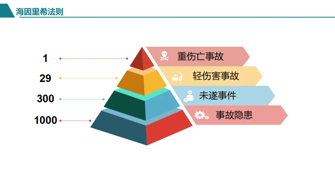 现代安全工程对海因里希法则进行了修正。在化工、航空等高风险行业,比例可能是1:10:30甚至1:5:10,因为高风险行业的能量更大,一次未遂就可能直接导致重大事故。