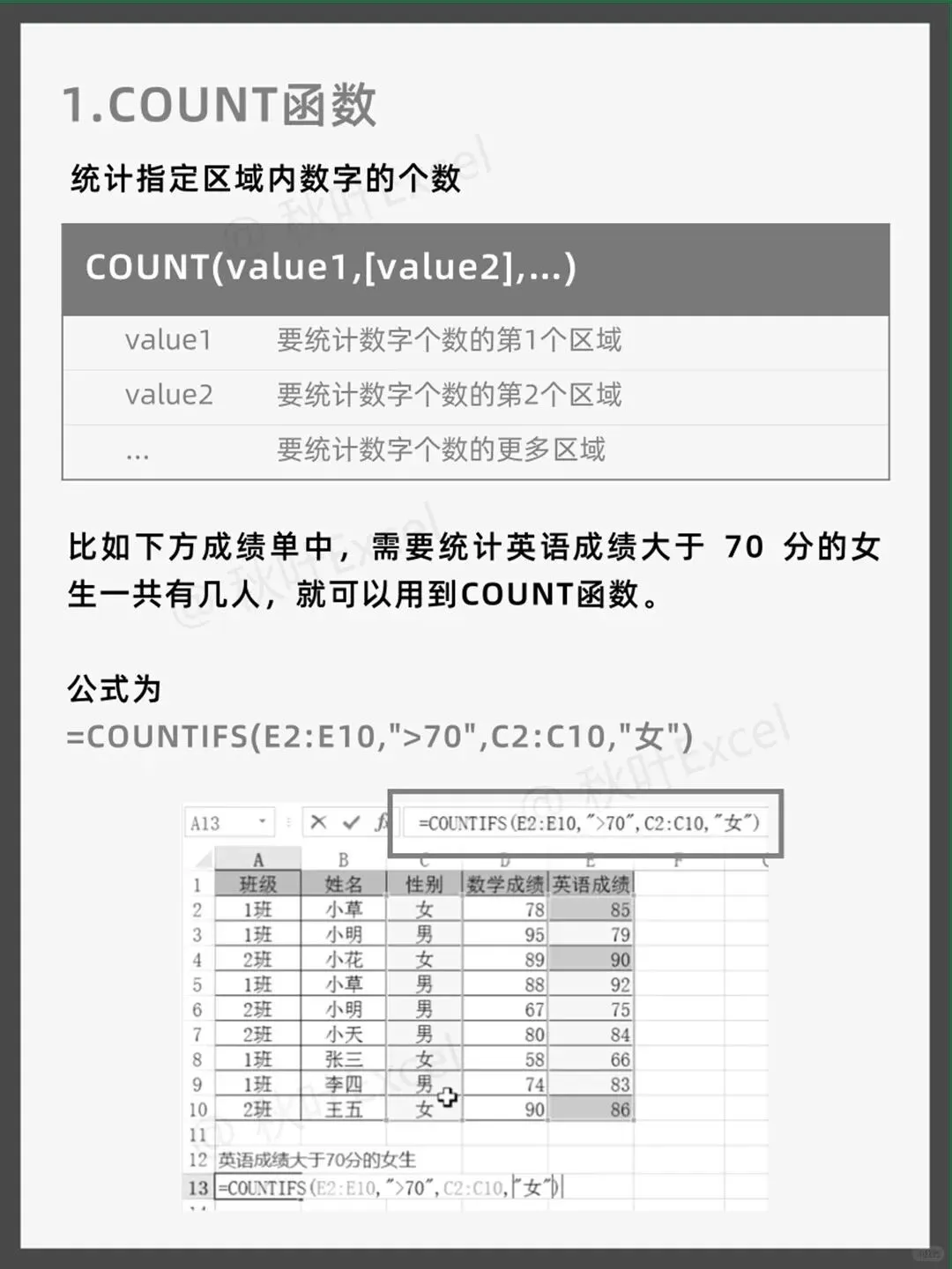 统计英语成绩大于70分的女生人数,条件区域E2:E10是英语成绩,条件“>70”,条件区域C2:C10是性别,条件“女”。