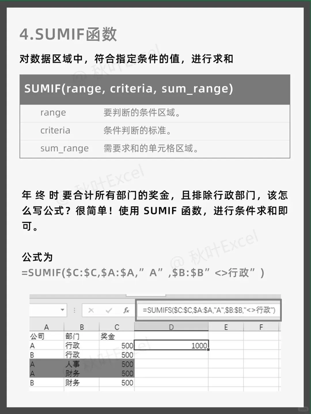 计算除行政部外所有部门的奖金总和,条件区域是部门列,条件为“<>行政”,求和区域是奖金列。