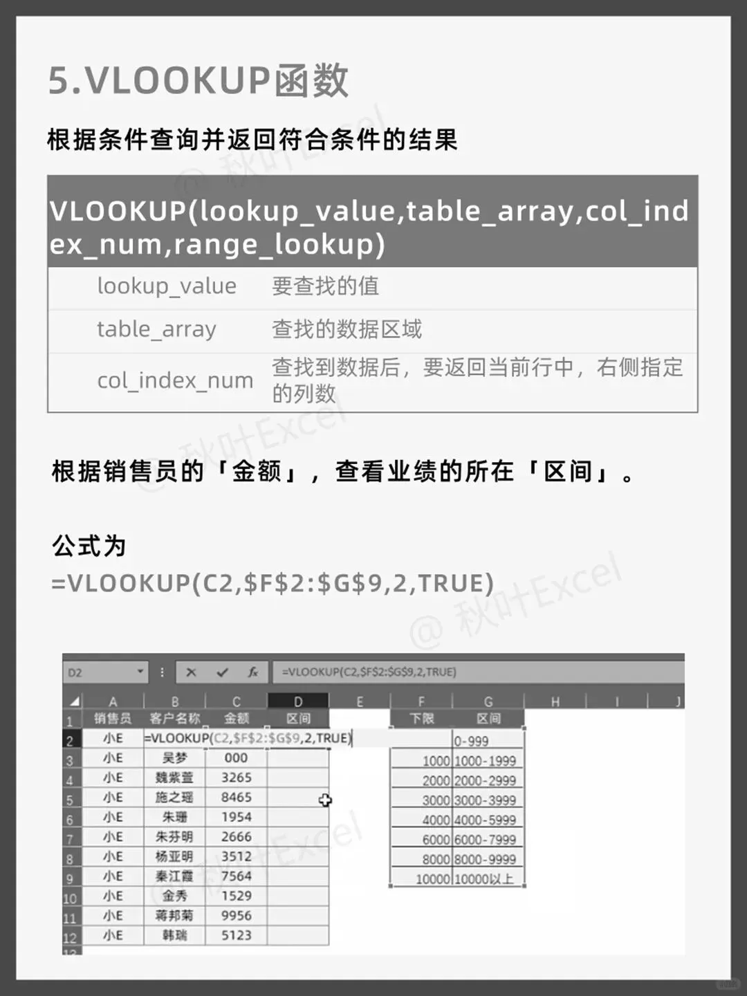 根据销售金额,在区间对照表中查找对应的业绩等级,第四个参数为TRUE(近似匹配)。