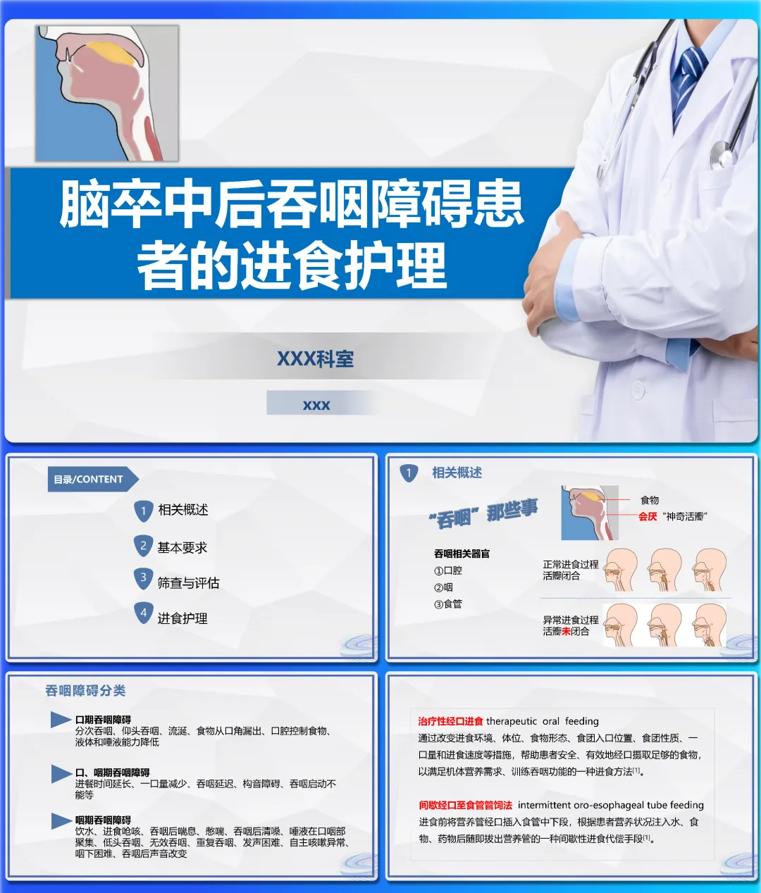 我是医览PPT,专注医护PPT课件,每天给大家带来各类医护课件(完整课件获取方式请看文末)会厌一开一合,食物一进一出,看似简单,实则危机四伏。今天拆解“脑卒中后吞咽障碍患者的进食护理”,把安全喂食从经验变成可评估、可执行的标准化方案。