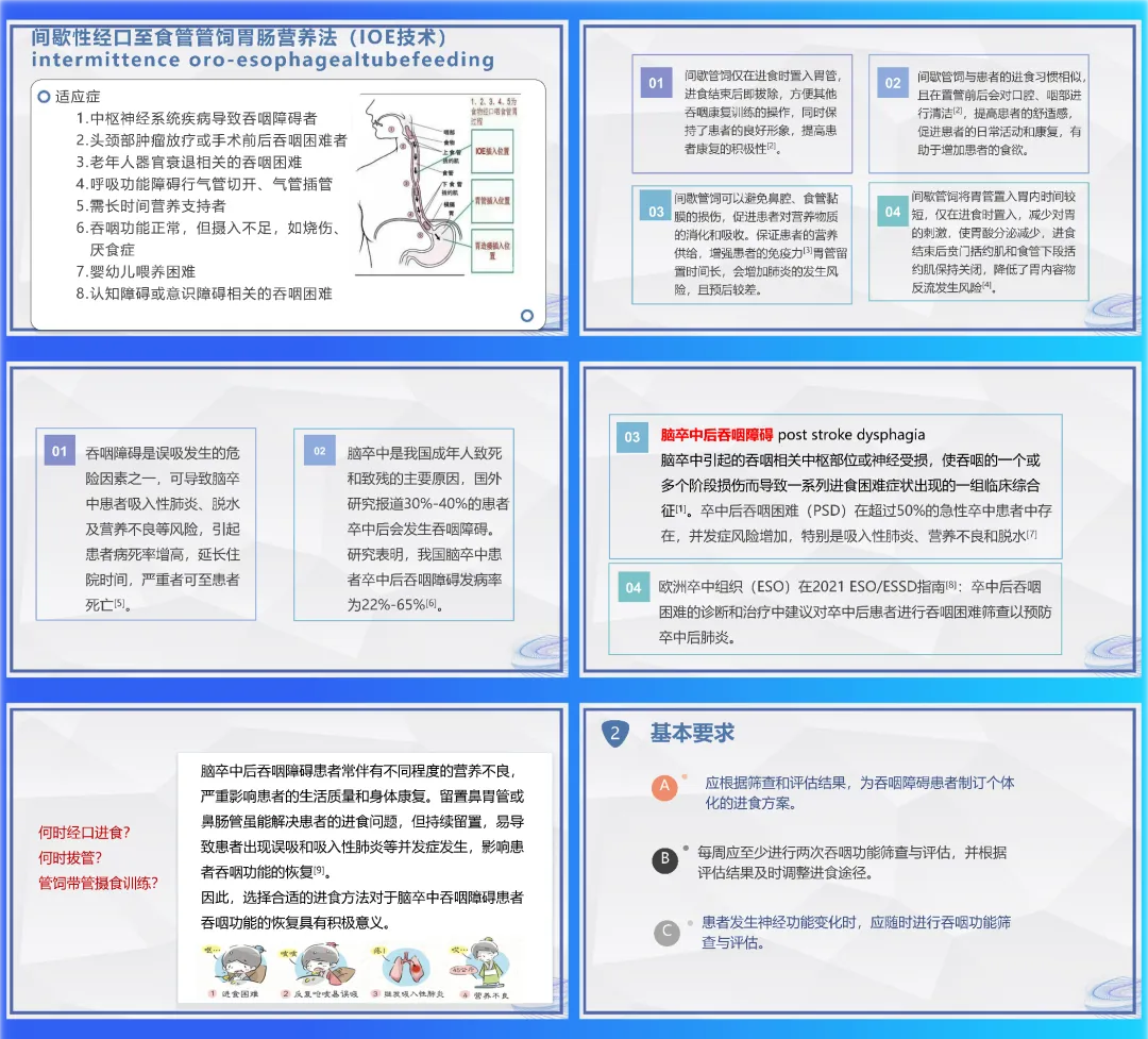 第一部分,相关概述:界定脑卒中后吞咽障碍的定义、发生率高及其严重后果(如吸入性肺炎)。重点介绍“治疗性经口进食”和“间歇经口至食管管饲法(IOE)”两种核心进食策略的概念与适应症,为后续选择提供理论框架。