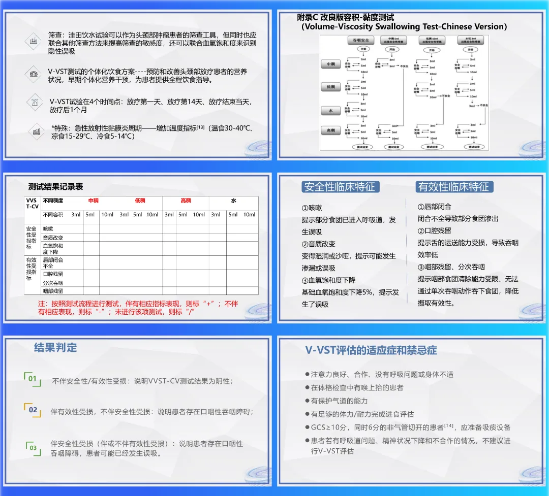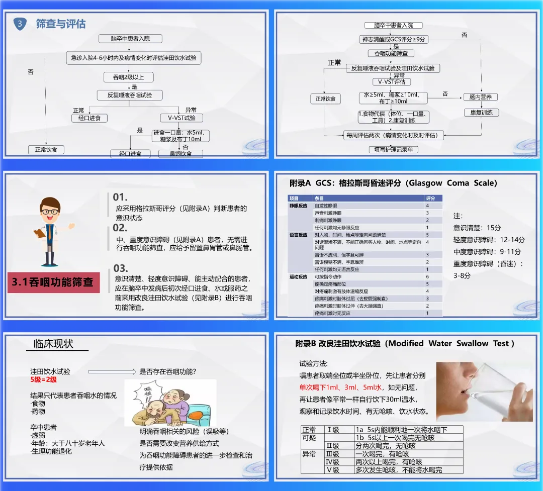 第三部分,筛查与评估:这是安全进食的决策基石。详细介绍意识评估(GCS评分)、吞咽功能初筛(改良洼田饮水试验)和进一步评估(改良容积-黏度测试VVST-CV)的方法、步骤与结果判定标准。重点在于教会你如何通过测试判断患者是否存在安全性受损(误吸风险)和有效性受损,从而科学选择进食途径与食物性状。