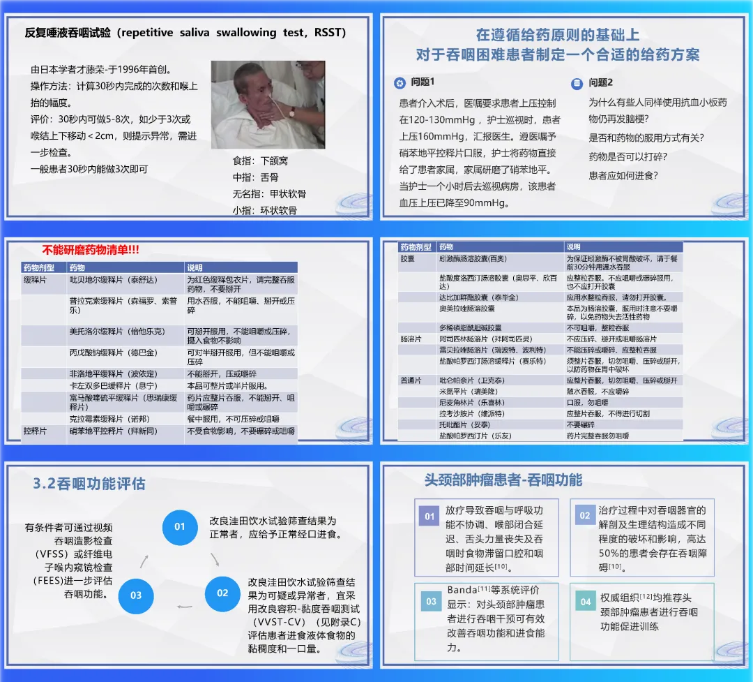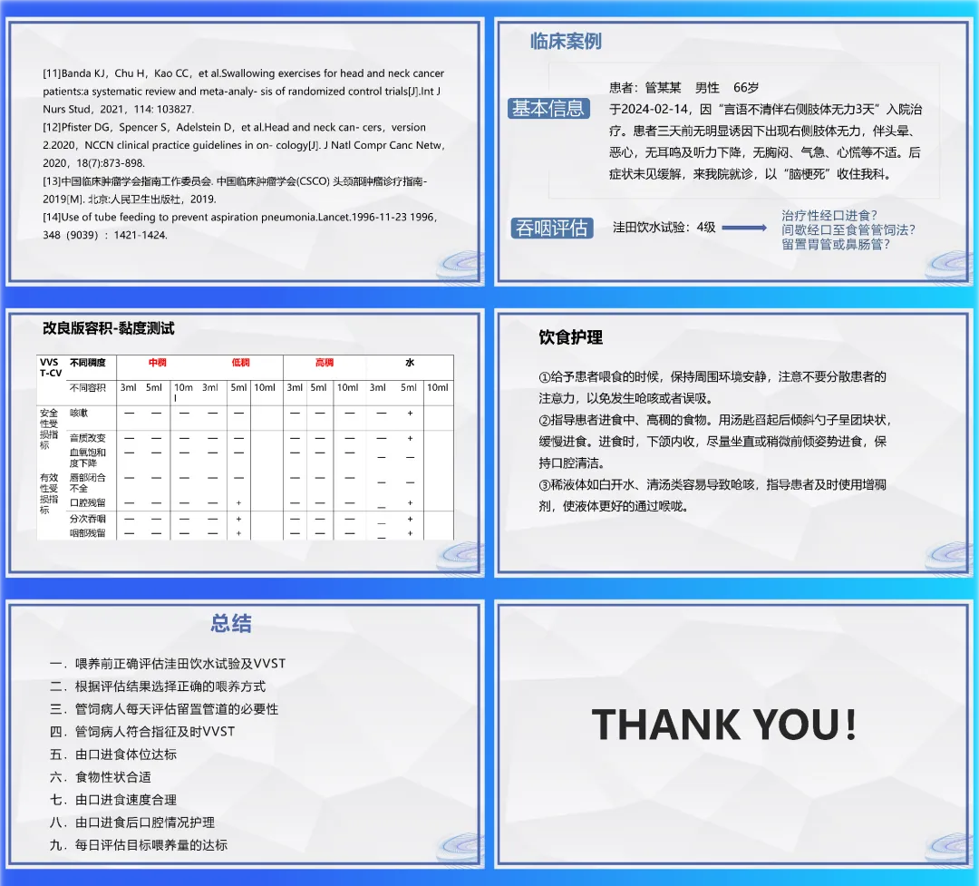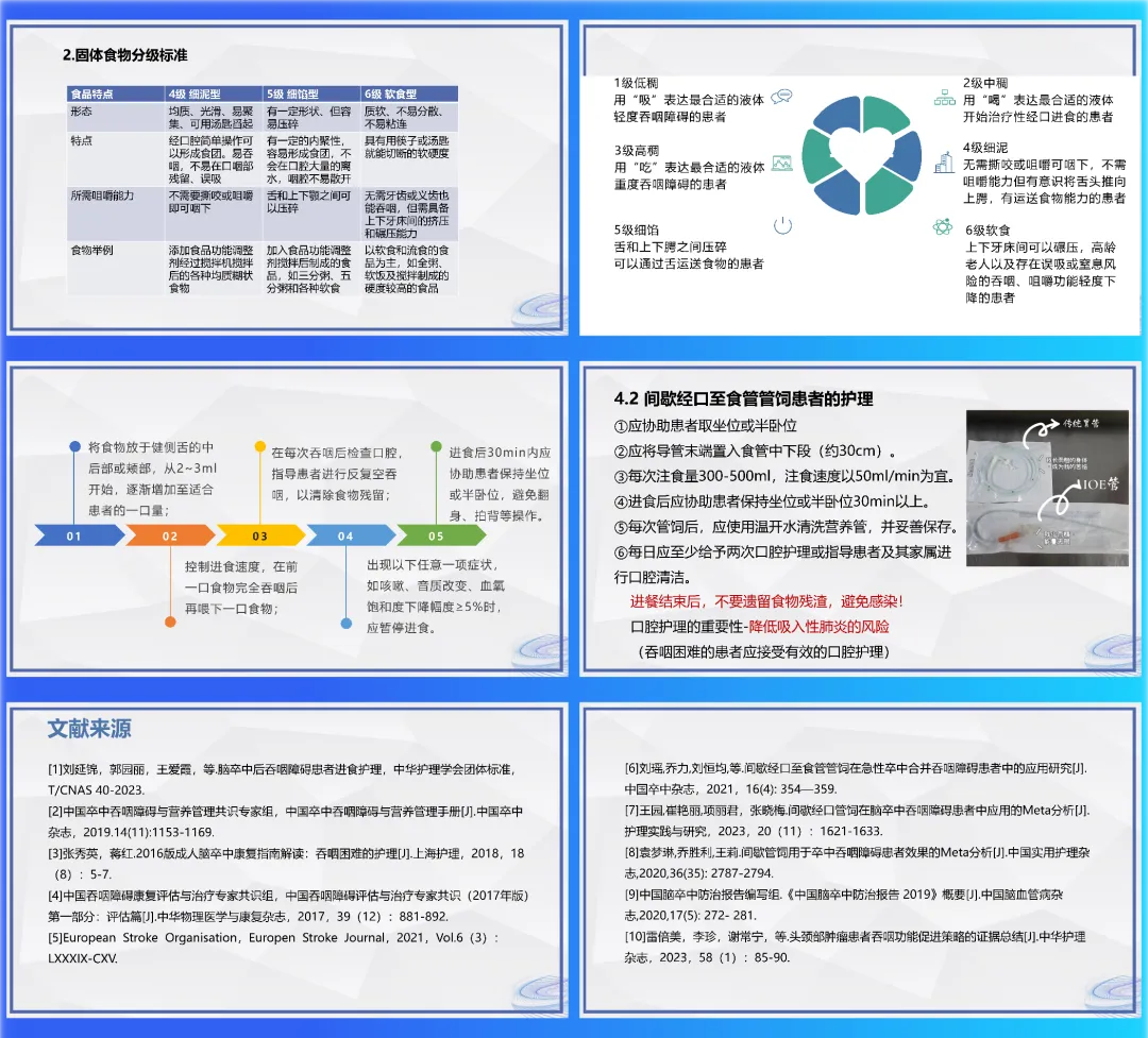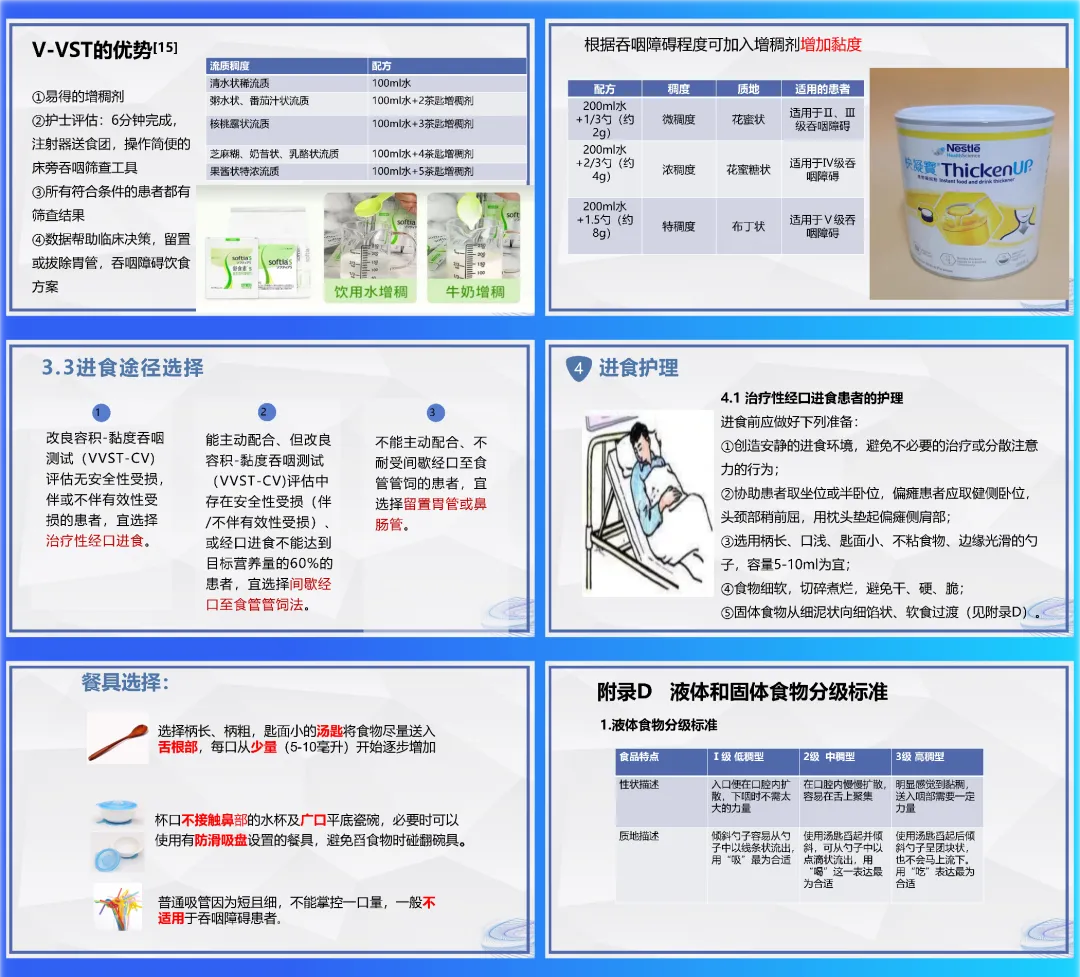 第四部分,进食护理:基于第三部分的评估结果,分述两种进食方式的具体护理。对于可经口进食者,明确环境、体位、餐具、食物形态、一口量、进食速度及进食后体位的全套规范。对于需间歇管饲者,明确置管体位、深度、注食速度与量、管道维护及口腔护理要求。最后通过临床案例,演示如何应用VVST评估结果指导具体护理决策