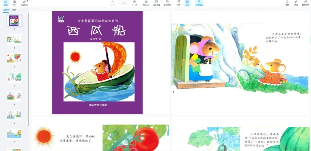 绘本阅读是幼儿教育的重要方式,但许多家长因孩子不识字或价格高而忽视其价值。实际上,绘本通过图文结合能同时刺激儿童的视觉和语言发展。优质绘本能提升儿童的认知、语言和社交能力。长期阅读对学业发展和亲子关系都有积极影响。绘本既是学习工具,也是亲子互动的桥梁。绘本PPT通过丰富多彩的故事和生动的画面,激发幼儿园儿童的学习兴趣,培养他们的阅读能力、想象力和创造力。 绘本PPT电子版画册涵盖了各种主题和风格,包括寓言故事、科普知识、生活常识、人际交往等方面,满足不同年龄段儿童的阅读需求。这些绘本不仅具有丰富的故事情节和精美的插图,还注重文字表达简洁易懂,适合幼儿园儿童阅读和理解。鼠小妹去外婆家,在路上天很热,但她没有偷摘路边的蔬菜水果。好心的小兔请她吃西瓜。还用西瓜皮做了条西瓜船,把鼠小妹送到了外婆家。