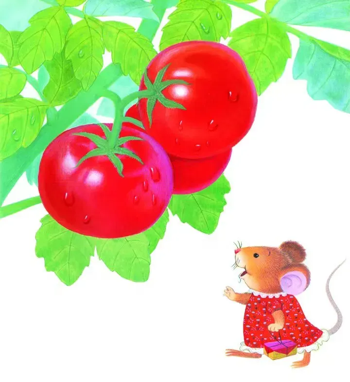 菜园里的番茄又大又圆,鼠小妹真想摘一个解解渴。但是她想:番茄的主人不在,我没有得到允许,不能吃!不能吃!
