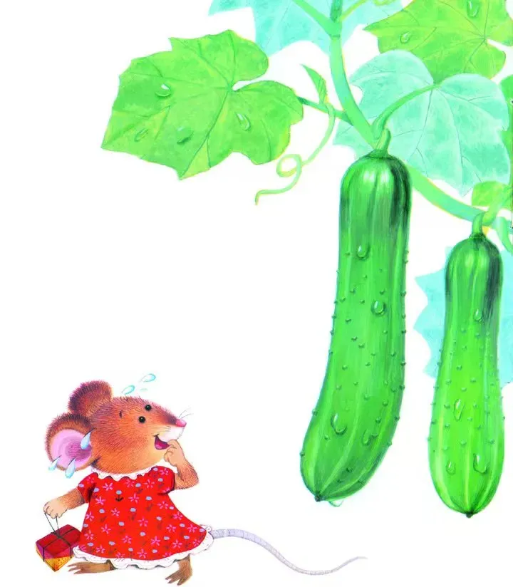 绿绿的黄瓜又脆又嫩,鼠小妹真想摘一根解解渴。可是她想:黄瓜的主人不在,我没有得到允许,不能吃!不能吃!