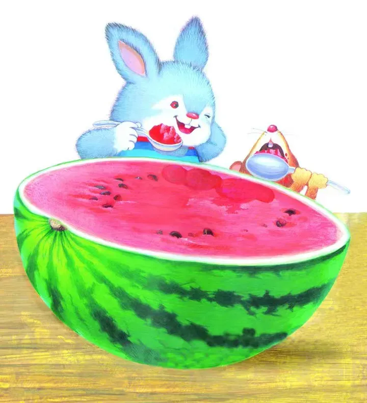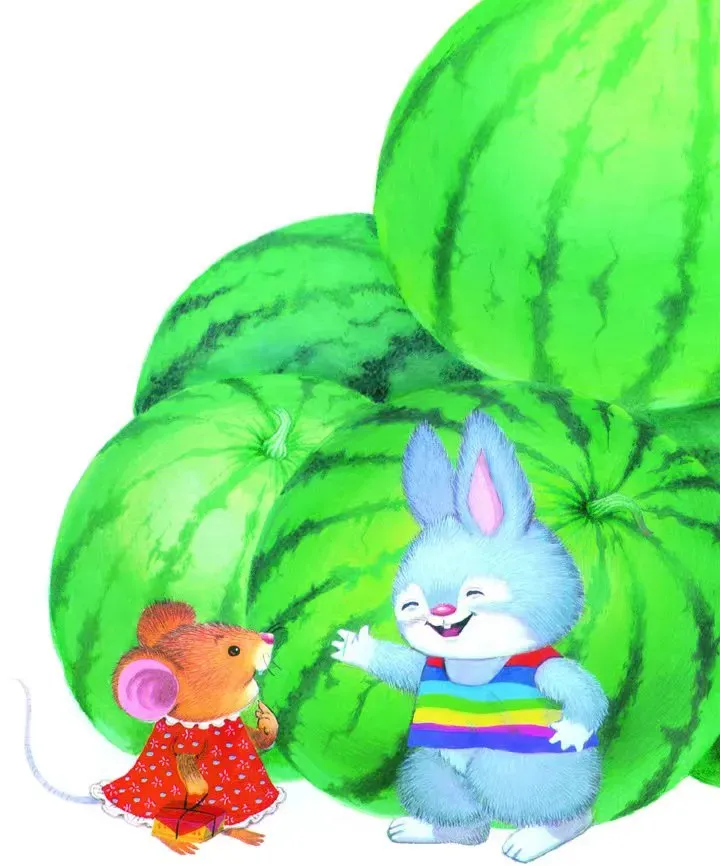 鼠小妹走过一片西瓜地,小灰兔正在地里摘西瓜,他说:“鼠小妹,请你尝尝我种的大西瓜吧!”