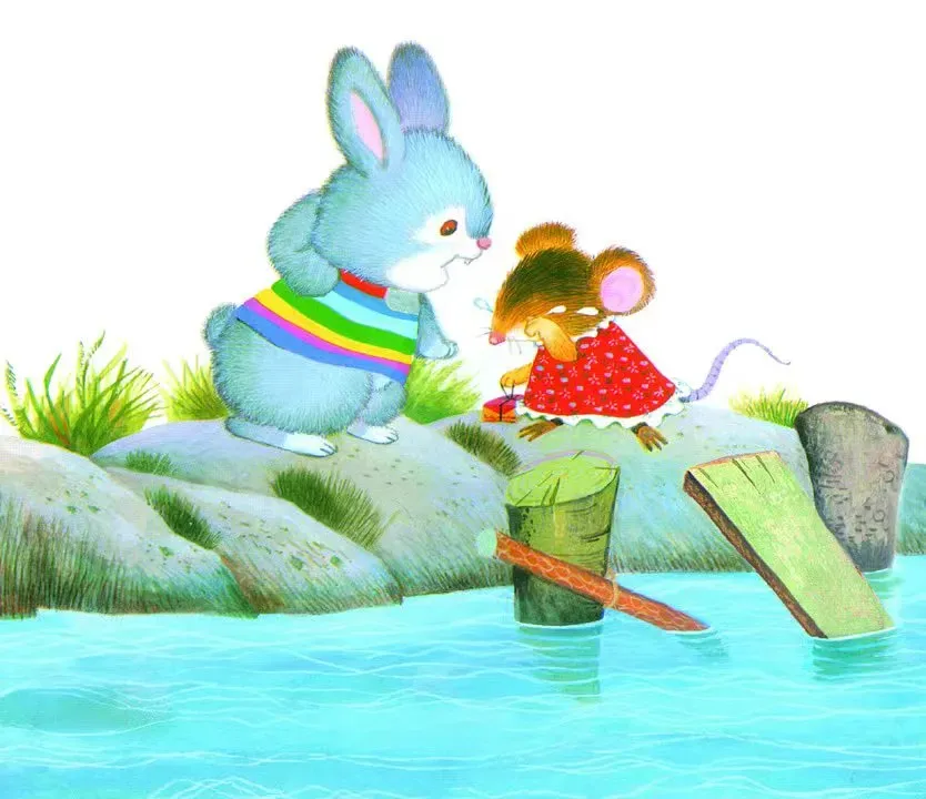 小灰兔把鼠小妹送到河边。呀,不好,河上的独木桥被大水冲断了!没有桥怎么过河呀!鼠小妹急得哭起来。小灰兔说:“别着急,别着急,我有好办法。”