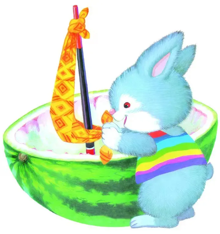 小灰兔跑回家,用吃剩的西瓜皮做了一条西瓜船。