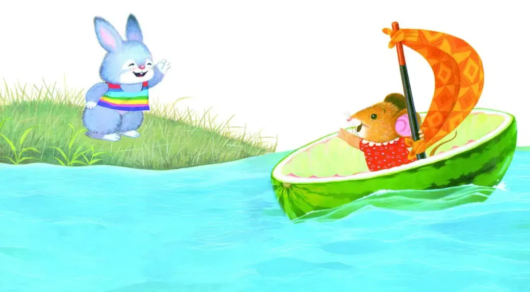 鼠小妹坐进西瓜船,说:“小灰兔,谢谢你,再见!”