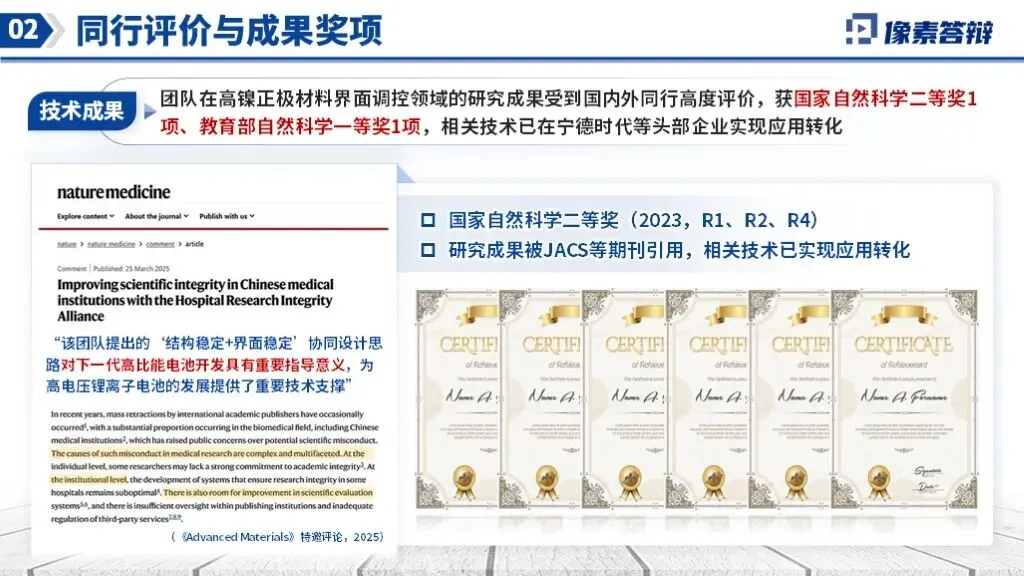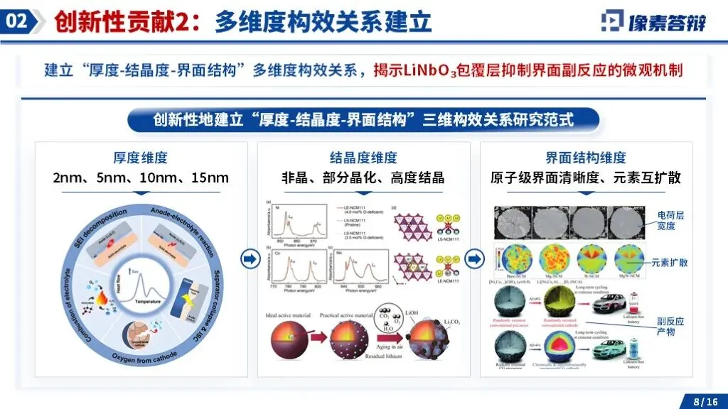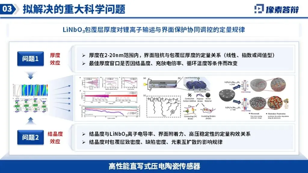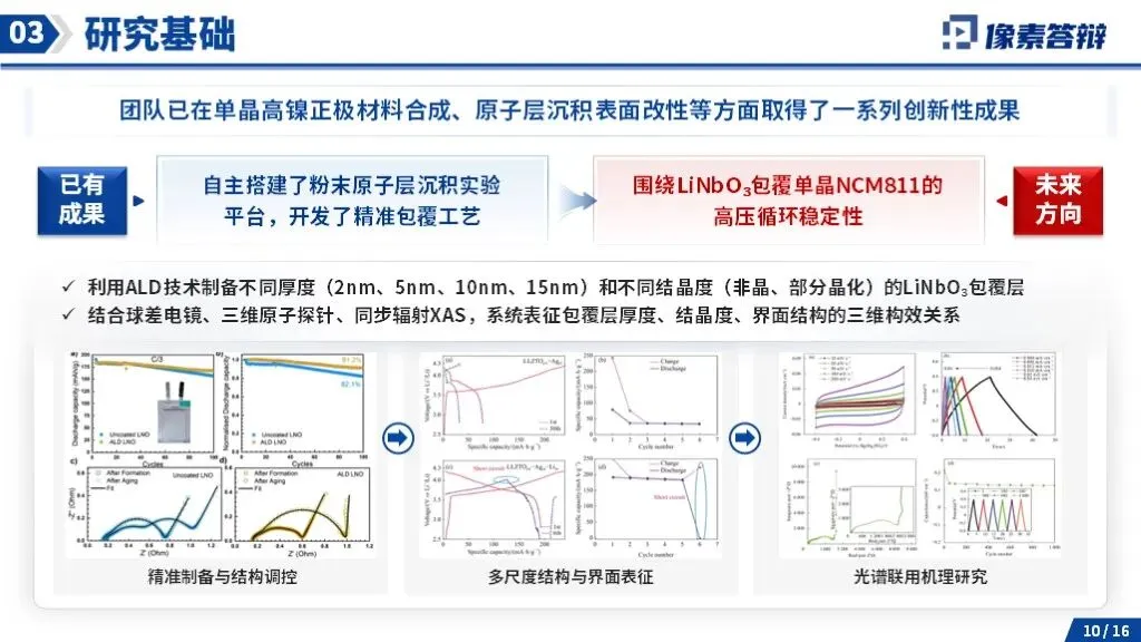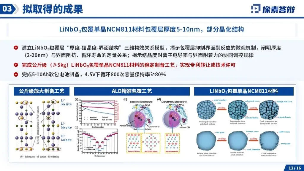 锚定立项价值针对高比能锂电池产业化痛点明确界面调控核心研究方向。推进构建覆盖材料合成表征模拟应用的完整团队依托 8 年协同攻关基础与多项国家级项目支撑。3 以NCM811与LiNbO3协同设计为核心技术突破高压循环界面失效瓶颈通过 ALD 技术实现包覆层厚度与结晶度双参数精准调控。建立厚度结晶度界面结构三维研究范式揭示包覆层抑制副反应的微观机制填补领域理论空白。获多项国家级奖项技术已在头部企业实现应用转化为下一代高比能锂电池提供核心技术支撑。若有侵权请随时联系我