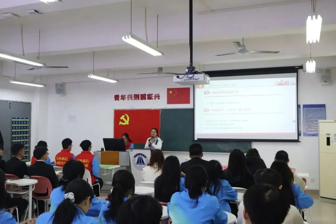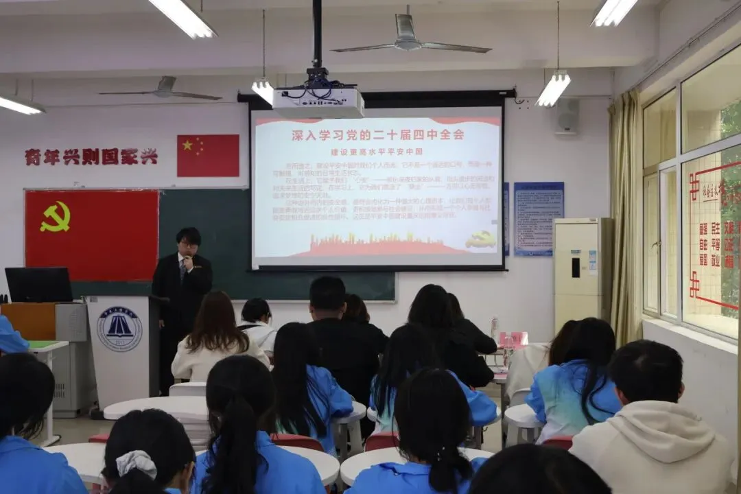 大会伊始,全体起立奏唱中华人民共和国国歌。随后市政工程学院学生党支部书记郑海燕就党的党的二十届四中全会公报重点内容进行第一议题的讲授。她围绕二十届四中全会公报的重点内容进行了系统讲解,重点解读了“十四五”时期取得的重大成就、“十五五”时期的战略定位与形势判断,强调我国发展依然具备稳、优、强的基础条件。老师重点阐述全会提出的“六个坚持”、主要目标以及2035年的远景蓝图,引导学生准确把握全会精神的核心要义,增强服务国家发展的责任意识与使命担当。