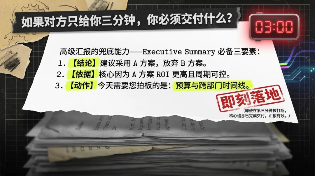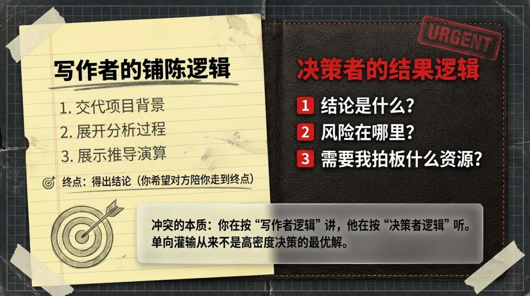 当你还在按“背景—分析—过程—结论”的顺序慢慢铺陈时,决策者想要的,往往是另一条路径:先告诉我结论,再告诉我风险,最后告诉我现在需要我拍什么板。