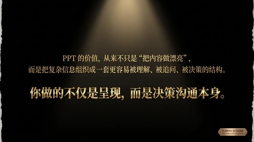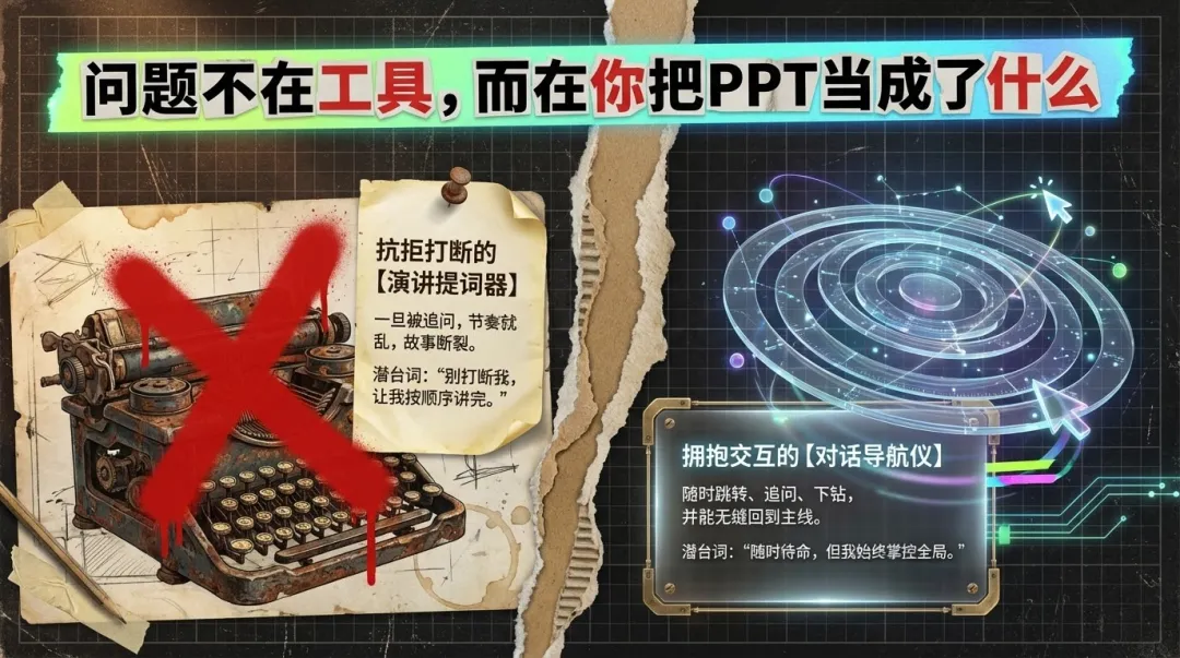 如果你把 PPT 当成“演讲提词器”,那它天然抗拒打断:你一旦被问,节奏就乱,故事就断,后面的页码仿佛都白做了。