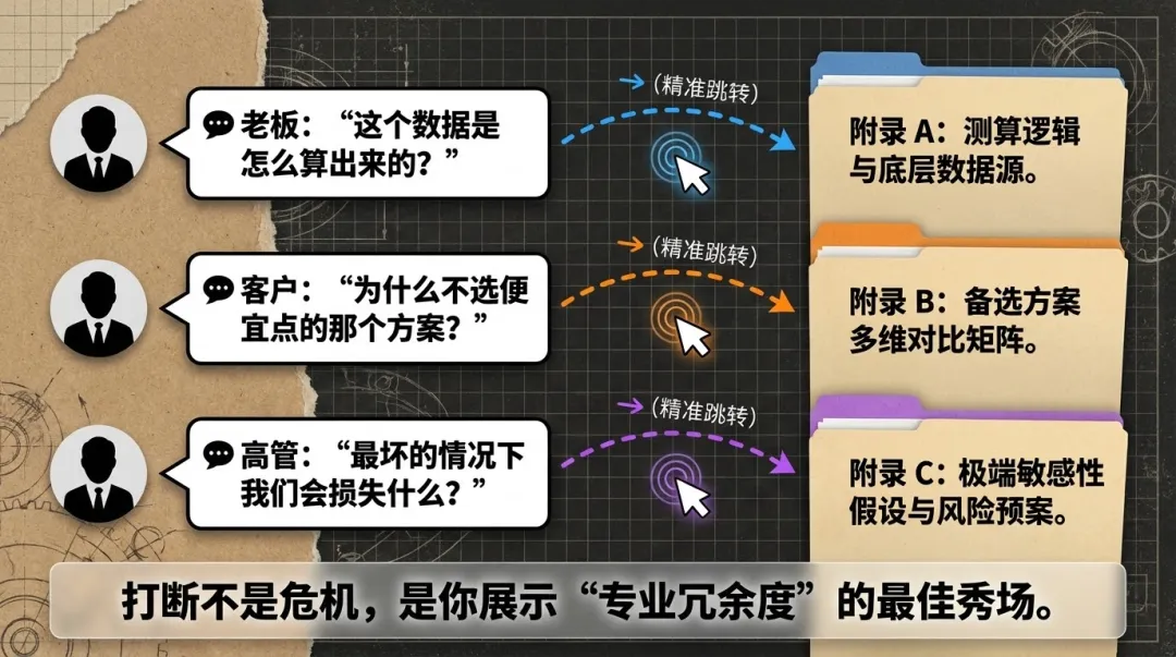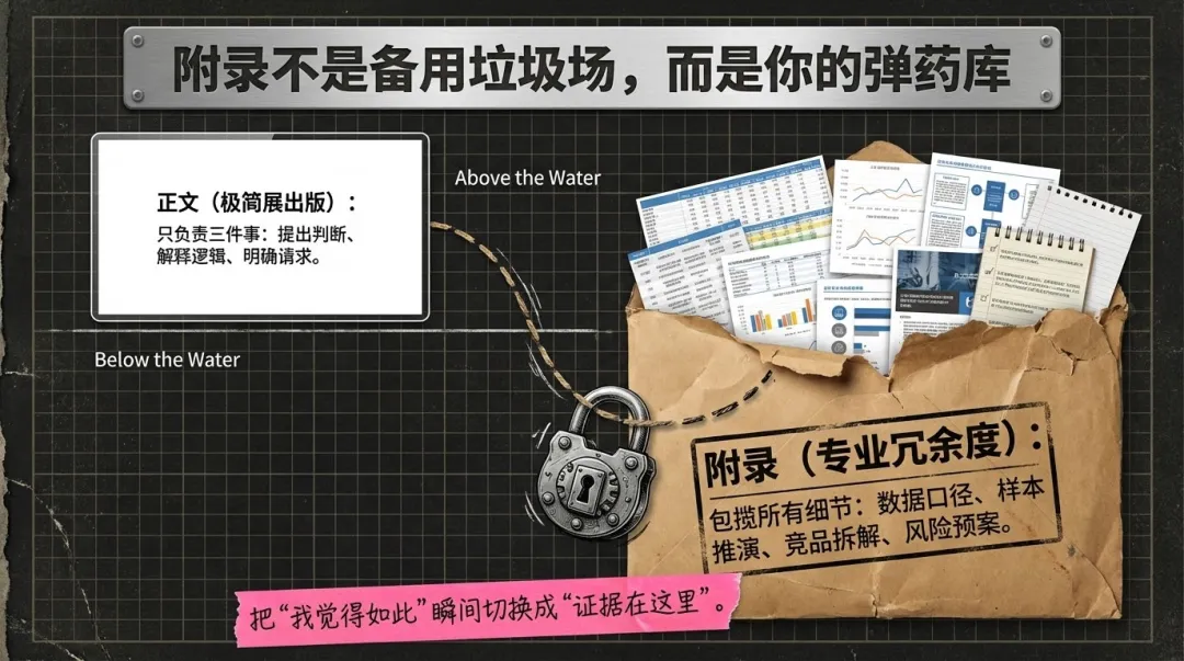 至于所有更细的内容——数据口径、样本来源、推演过程、敏感假设、竞品拆解、备选方案、风险预案——应该进入附录体系。