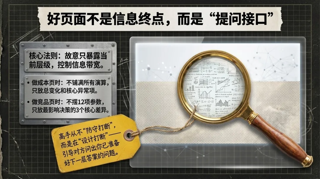 在决策型汇报里,页面最大的价值不是展示你知道多少,而是控制信息带宽,让对方在当前时刻只看到最该看的那一层。
