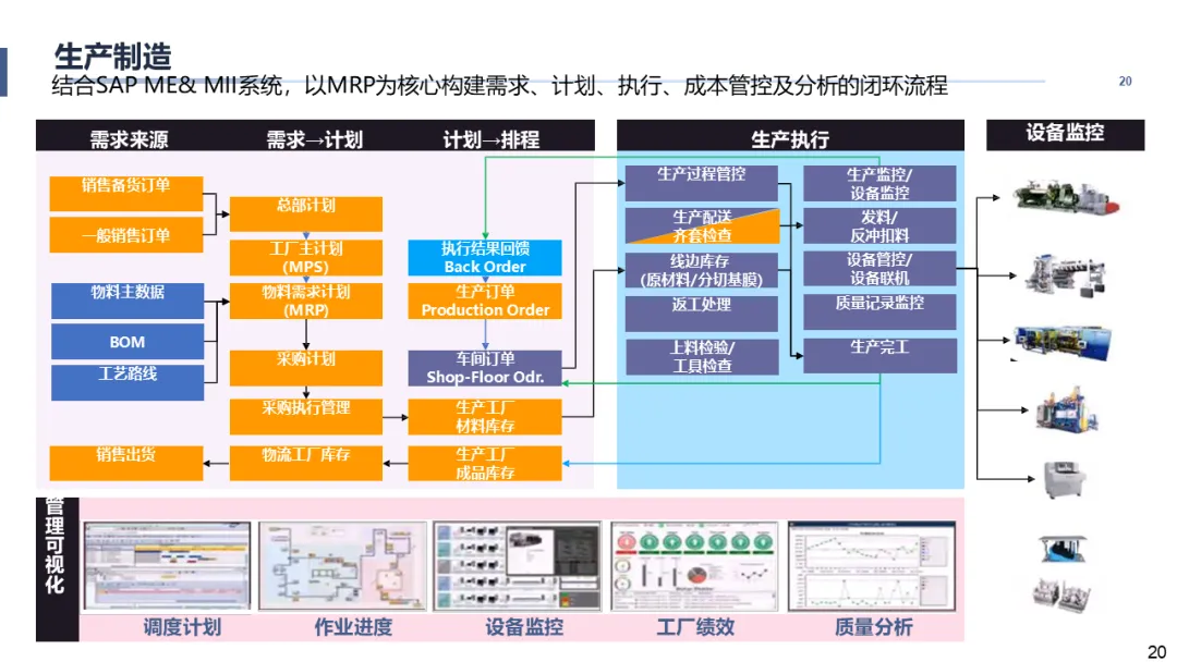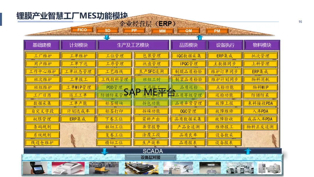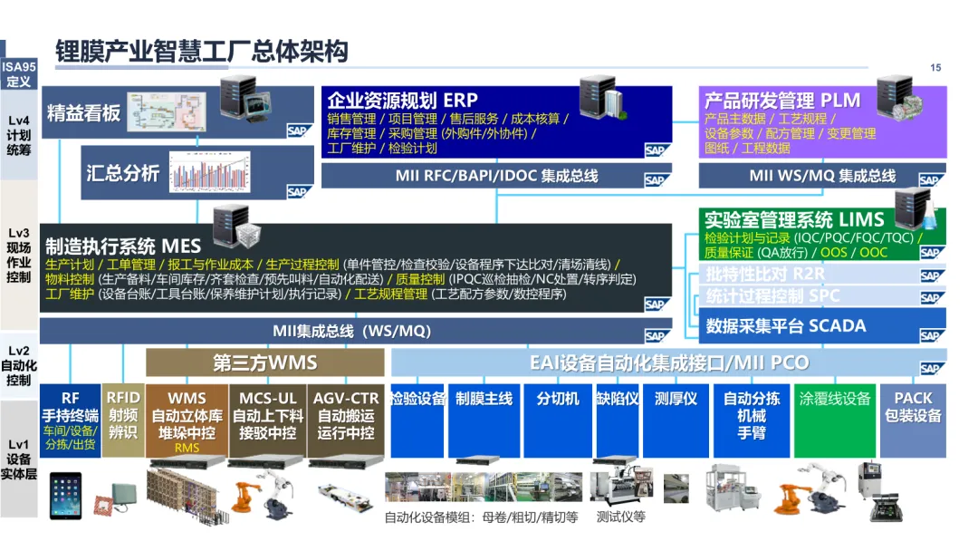 方案首先立足于锂膜产业的业务全景与核心竞争能力,深刻剖析了来自外部环境与内部管理的多重痛点。面对多组织管控、流程不统一、车间执行黑箱、质量追溯困难等挑战,本蓝图明确了“搭建以财务精细化管理为核心,打通端到端业务链条”的核心目标。方案创新性地提出了“平台统一、流程求同存异、主数据标准化”的实施原则,规划了“ERP整合优化+MES新建”的并行路径。其总体架构严格遵循ISA-95标准,自上而下贯通企业经营层(SAP ERP)、制造运营层(SAP ME/MES)、过程控制层(SCADA)与设备层,并通过统一的集成平台(MII)确保数据无缝流通。这为企业构建了一个坚实、灵活、可扩展的数字化底座,为后续的精细化管控与智能化分析奠定了坚实基础。