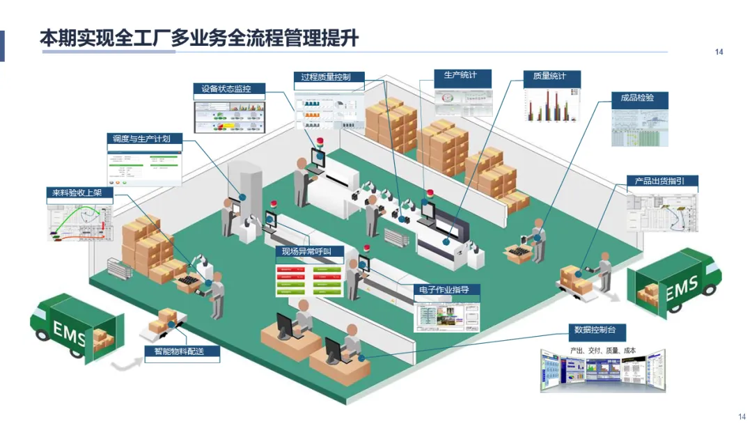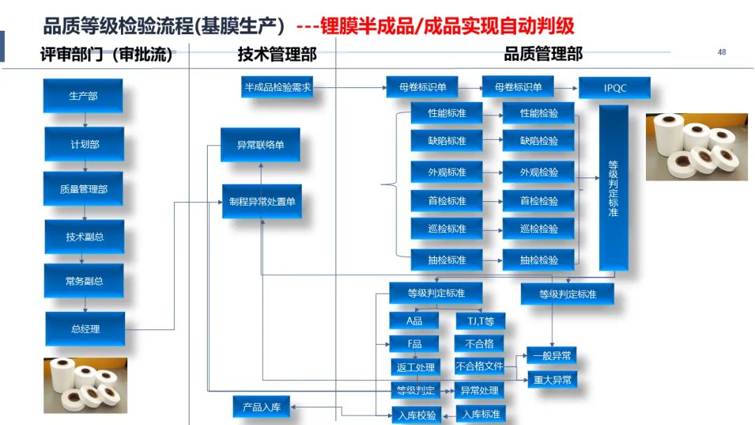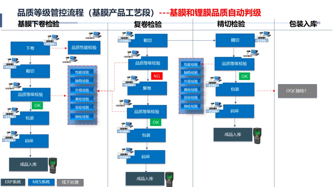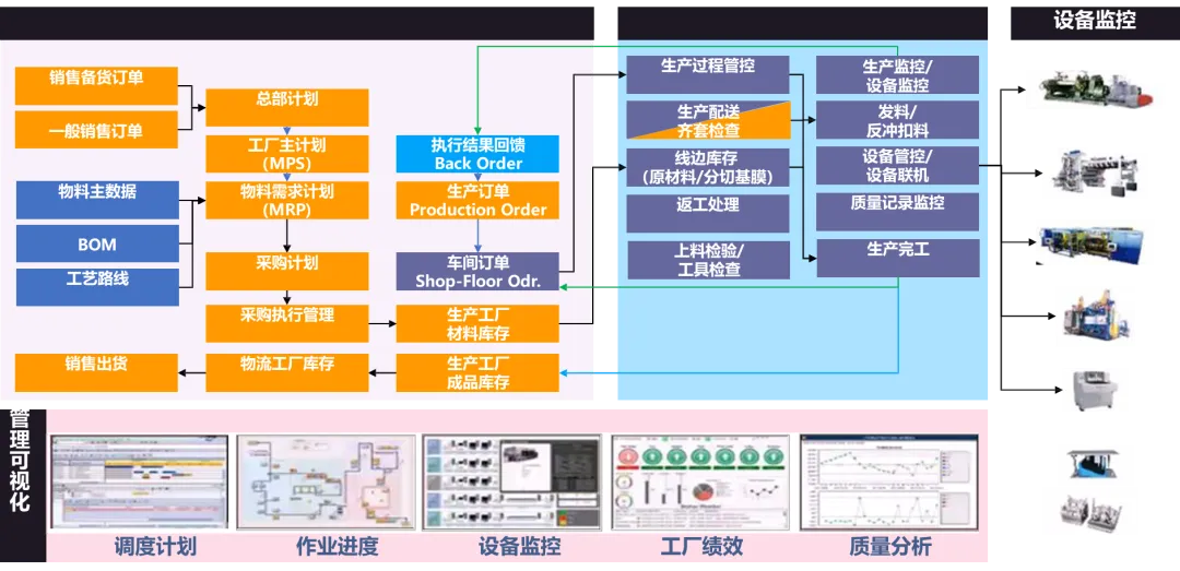实现车间现场的“可视、可控、可优”是本方案的重中之重。针对计划达成率低、在制品积压、物料齐套难、设备效率不透明等痛点,智慧MES规划了覆盖计划、执行、质量、设备的全功能模块。方案详细规划了从“销售订单->工厂计划->车间工单”的智能派工与调度机制,并通过条码(卷号、箱号、托盘码)贯穿原材料、制膜、制浆、涂覆、分切、包装的全流程,构建了完整的正反向追溯体系。通过集成SCADA与设备数采,实时监控设备状态、工艺参数与能耗,并将检验计划(IQC/IPQC/FQC/OQC)融入生产流程,实现品质的在线管控与自动判级。最终,通过车间战情室、移动APP等多维度的目视化看板,将生产进度、设备OEE、质量良率等关键指标实时呈现,让管理决策拥有“千里眼”和“顺风耳”。